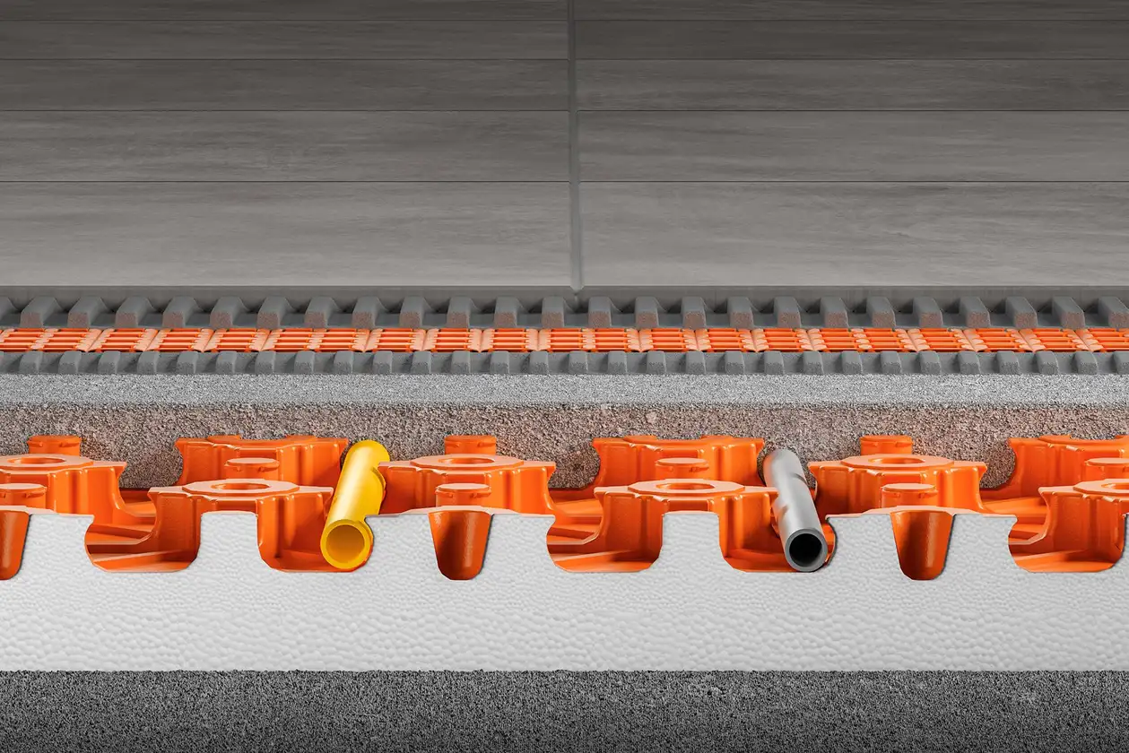Plošné vytápění se v místnosti stará o příjemné teplo bez průvanu nebo studených zón – náš kompletní systém vyhřívá i podlahové plochy, kde nejsou topné trubky nebo kde jsou topné trubky položené s větším rozestupem. Umožňuje to separační rohož DITRA mezi vyhřívaným potěrem a dlažbou obsahující spoustu vzduchových kanálků, kterými se teplo rozvádí ještě rovnoměrněji. Podlaha se tak stává jedním velkým topným tělesem, které ale dokáže na přání i chladit.