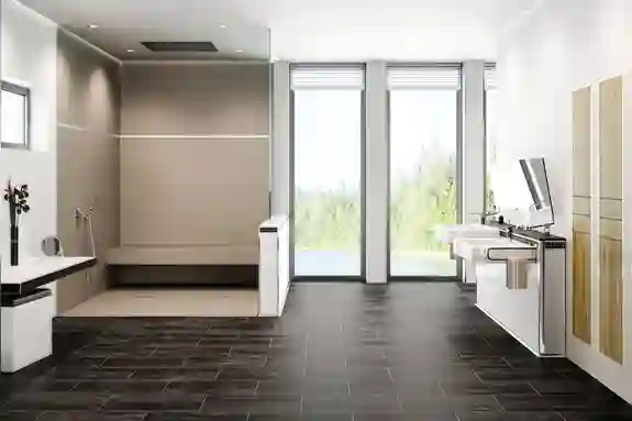 Bezbariérové sprchy se těší rostoucí oblibě: vstupní schůdky a sprchové vany s vysokými okraji patří minulosti, protože sprchy se díky snadno přístupnému designu zarovnanému s podlahou stává plynule integrovanou součástí prostředí koupelen. Ideální pro životní fáze rozrůstající se rodiny nebo pro ty, kteří chtějí svůj dům učinit bezpečným i do budoucna. Díky nepřítomnosti schodů nebo oddělení sprchy se oblast sprchy automaticky otvírá zbytku koupelny, čímž je snazší i čištění a péče o celý prostor.