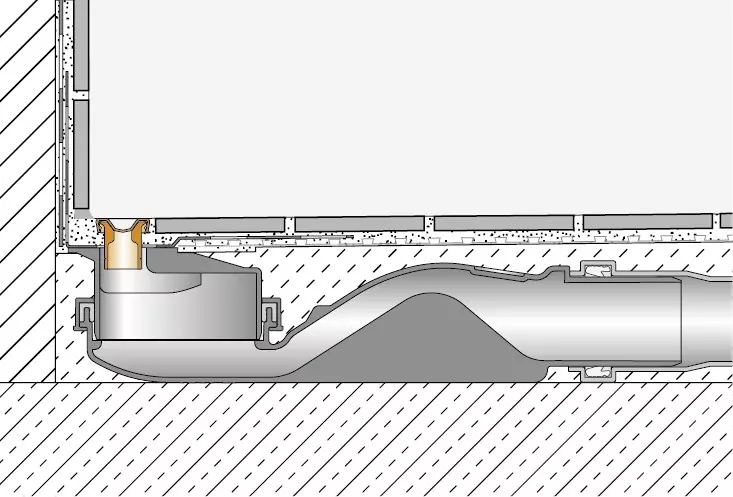 U KERDI-LINE-VARIO je nutné z konstrukčních důvodů položit kvůli variabilnímu provedení odtoku spádový potěr. Potěr se na povrchu izoluje pomocí DITRA (viz technický list výrobku 6.1) nebo DITRA-HEAT (viz technický list výrobku 6.4). Jako doplněk systému jsou k dispozici Schlüter-SHOWERPROFILE-S a R (viz technický list výrobku 14.1) pro napojení k podlaze, resp. na stěnu. Kvůli sklonu bočních stran má SHOWERPROFILE-S odpovídající tvar klínu. Ohraničující stěny se izolují pomocí KERDI (viz technický list výrobku 8.1) nebo KERDI-BOARD (viz technický list výrobku 12.1).