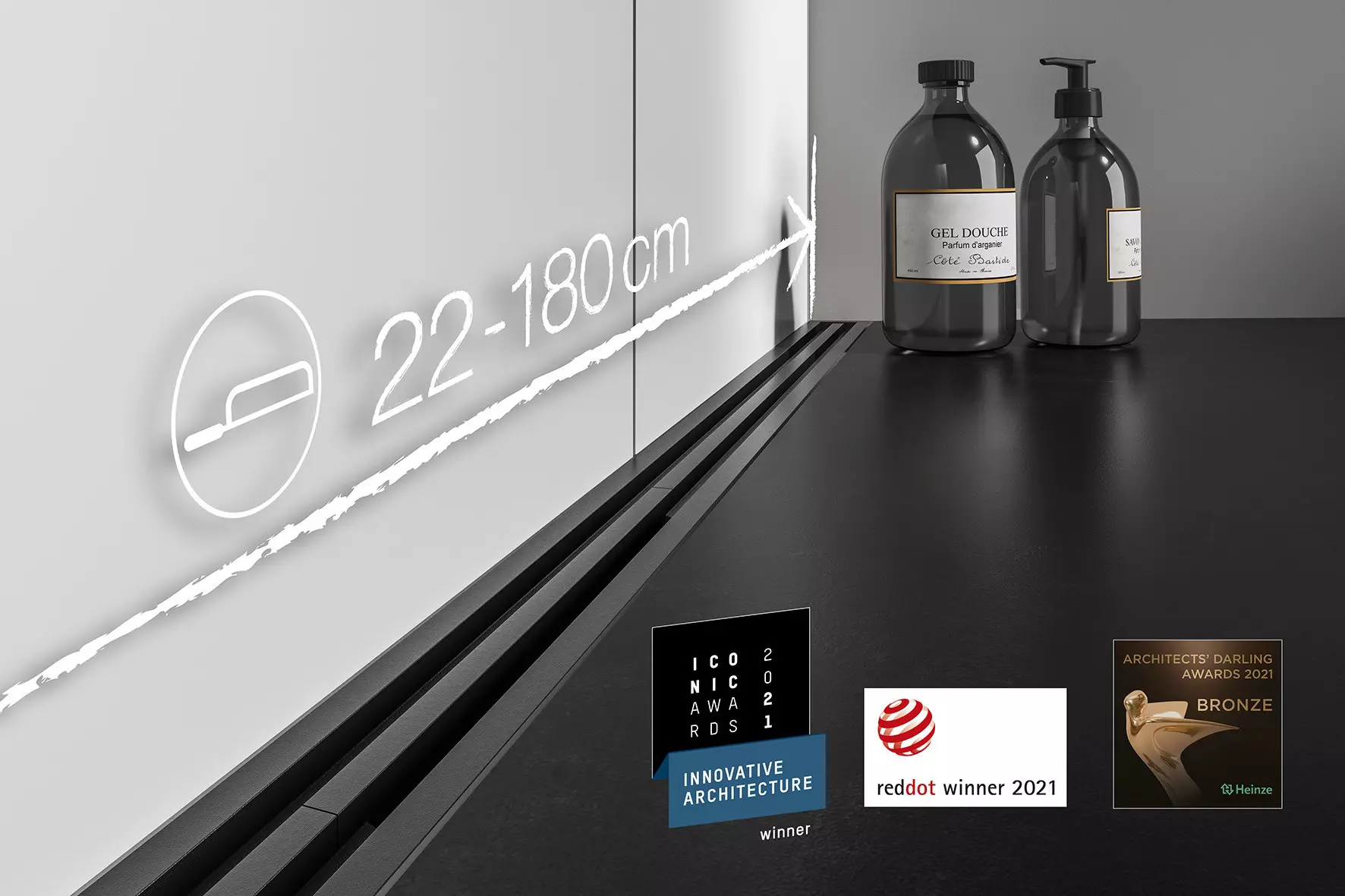 V hliníkovém provedení jsou k dispozici dvě šířky profilu 34 mm a 42 mm. U užšího provedení je středová odtoková štěrbina široká pouhých 14 mm a dlouhá 140 mm. U provedení širokého 42 mm je odtoková štěrbina široká 20 mm a dlouhá 140 mm. Díky tomu nabízí dostatečný prostor pro vložení volitelně dodávaného sítka na vlasy.