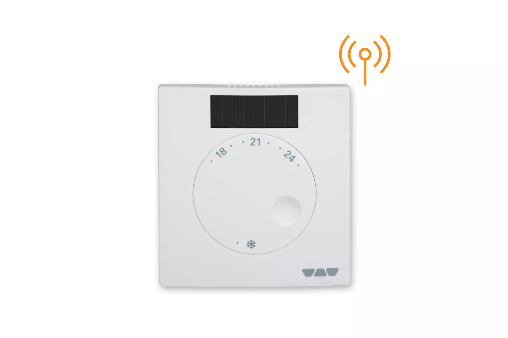 Schlüter-BEKOTEC-THERM-ER/WL er en trådløs rumtermostat ”varme/køle”. Den nominelle temperatur kan indstilles fra 8 til 30 °C og overføres trådløst til tilslutningsmodulet BEKOTEC-THERM-EAR/WL. Energiforsyningen sker via den integrerede solcelle, alternativt med det medfølgende knapcellebatteri.