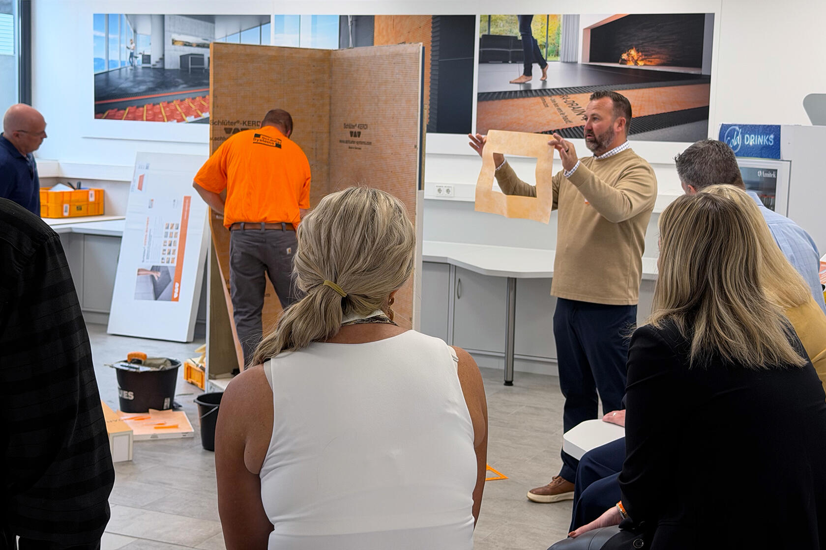 Im Fokus des Programms stand ein Vortrag zum Thema „Abdichtung“, gefolgt von einem Rundgang durch Produktion und Logistik. Höhepunkt war ein praxisnaher Workshop in der Schlüter-WorkBox: Hier demonstrierte Vorführmeister Shon Parker eindrucksvoll, wie schnell und unkompliziert Abdichtungen mit Schlüter-Systemlösungen umgesetzt werden können. Zum Einsatz kamen auch Produkte aus dem nordamerikanischen Sortiment, speziell angepasst an die dort geltenden Standards und Methoden.
