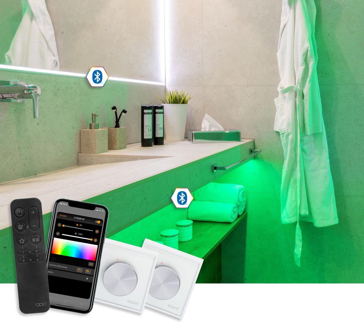 Die Sets enthalten 2 LIPROTEC-ZONES-Bluetooth-Mesh-Receiver sowie eine passende Fernbedienung inklusive Wandhalterung. Dank des innovativen Bluetooth-Mesh-Systems ist es möglich, diverse Lichtquellen auch über längere LED-Strecken zuverlässig zu bedienen. Dazu stehen drei Möglichkeiten zur individuellen und komfortablen Steuerung zur Verfügung: