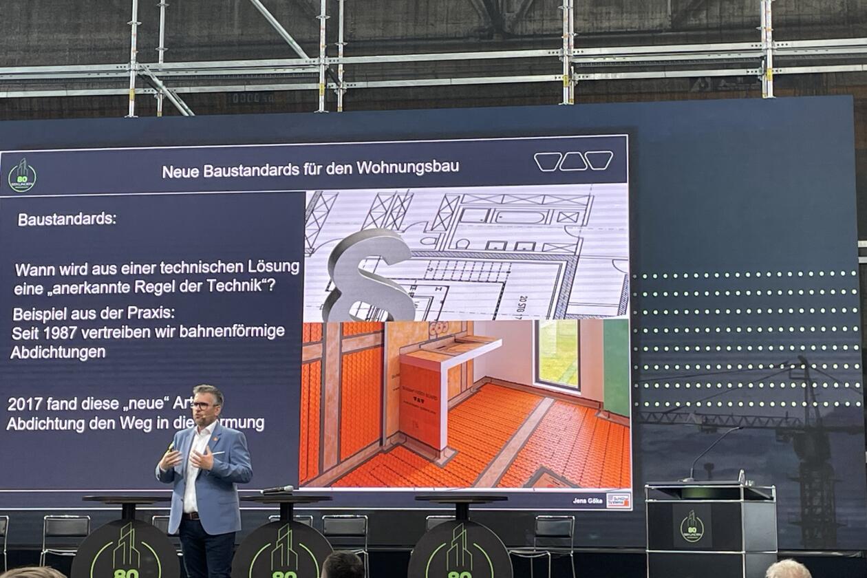 „Neues Bauen braucht verlässliche Standards“, betonte Schlüter-Referent Jens Göke im Rahmen seiner Keynote. „Wir müssen beginnen, anders und vor allem einfacher zu bauen.“ Anhand eines konkreten Beispiels machte er deutlich, wie lange es oft dauert, bis technisch funktionale Lösungen zu anerkannten Regeln der Technik werden: „Seit 1987 vertreiben wir bahnenförmige Abdichtungen, die den Bauprozess verkürzen und viele weitere Vorteile mit sich bringen. Aber erst 2017 fand diese Art der Abdichtung ihren Weg in die DIN 18534 zur Abdichtung von Innenräumen.“