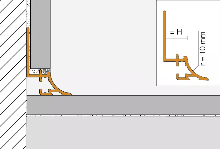 Schlüter-DILEX-AHKA ist ein aus eloxiertem Aluminium gefertigtes Hohlkehlprofil für Wandinnenecken, Küchenarbeitsplatten oder Ablagen, die einen keramischen Belag erhalten. Es ist in verschiedenen eloxierten Oberflächen erhältlich und kann einseitig an vorhandene Beläge angeschlossen werden. Die Außenfläche der Profile bildet eine symmetrisch gerundete Innenecke der Fliesenbeläge. Durch den integrierten Fugensteg wird eine definierte Fugenkammer zur Fliese vorgegeben.