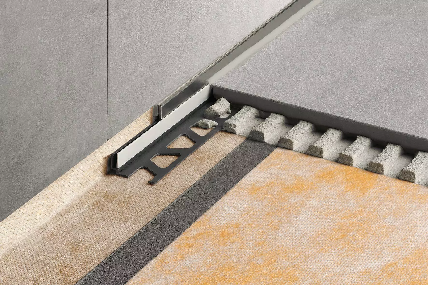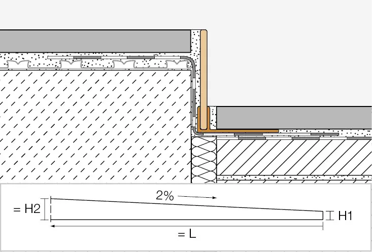 Zum anderen bietet SHOWERPROFILE-S zur bodenseitigen Aufnahme ein systemzugehöriges Trägerprofil aus Hart-PVC in verschiedenen Höhen mit U-förmiger Aufnahmenut. Passen Sie die Höhe des Duschprofils je nach Bedarf an, indem Sie den überlangen Gefällekeil an der niedrigen und/oder hohen Seite einfach kürzen. Der Gefällekeil ist links oder rechts zum Bodenübergang oder unter den Fliesen einer Seitenwand verwendbar.