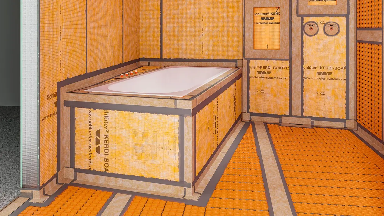 Sie revolutionierte einst den Markt und ist seitdem unter der Fliese nicht mehr wegzudenken: die KERDI-Abdichtungsbahn in leuchtendem Orange. Aus der leichten, wasserdichten Folie mit Vliesoberfläche ist bis heute ein komplettes System von aufeinander abgestimmten Komponenten für die Verbundabdichtung gewachsen, das Nassbereiche sicher und normkonform vor Wasser schützt.