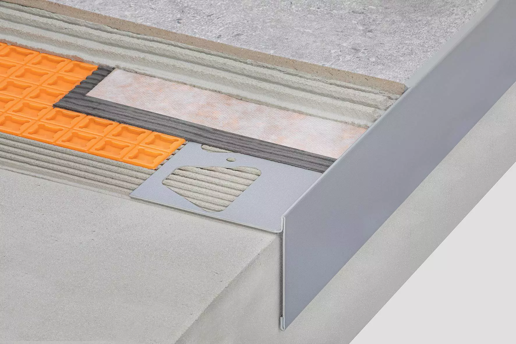 Das Profil bewirkt einen optisch sauberen Randabschluss und deckt die Fliesenkanten sowie die freien Estrichkanten ab.