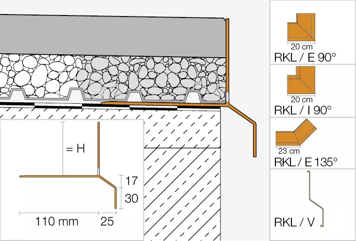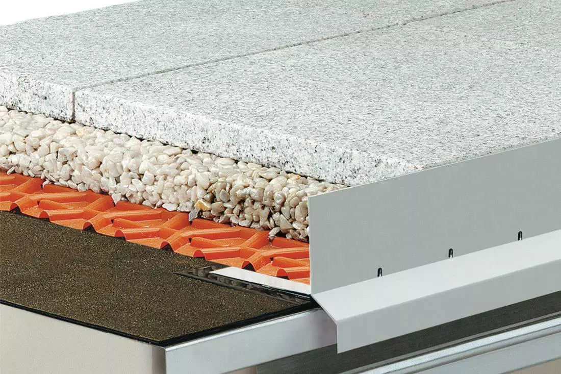Für einen perfekten Abschluss von großformatigen Plattenelementen haben wir Schlüter-BARA-RKL entwickelt. Das winkelförmige Randprofil ist aus farbig beschichtetem Aluminium gefertigt und eignet sich für Bodenbeläge, die wahlweise auf ungebundenen Kies- und Splittschüttungen oder auf Stelzlagern, wie zum Beispiel Schlüter-TROBA-STELZ, verlegt werden. Der vertikale, nach oben gerichtete Abschlussschenkel überdeckt die Sicht auf die Belagskonstruktion und schützt den freien Belagsrand vor einem Auswandern des Schüttgutes. Für einen Ablauf der Feuchtigkeit sorgen die angebrachten Entwässerungslöcher.