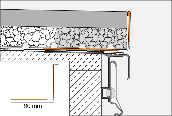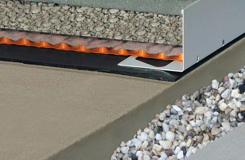 Schlüter-BARA-RWL ist ein winkelförmiges Abschlussprofil für großformatige Plattenelemente, die wahlweise auf ungebundenen Kiesschüttungen oder als aufgestelzte Beläge, die auf Abdichtungen gemäß DIN 18531 mit Drainageebene verlegt werden.