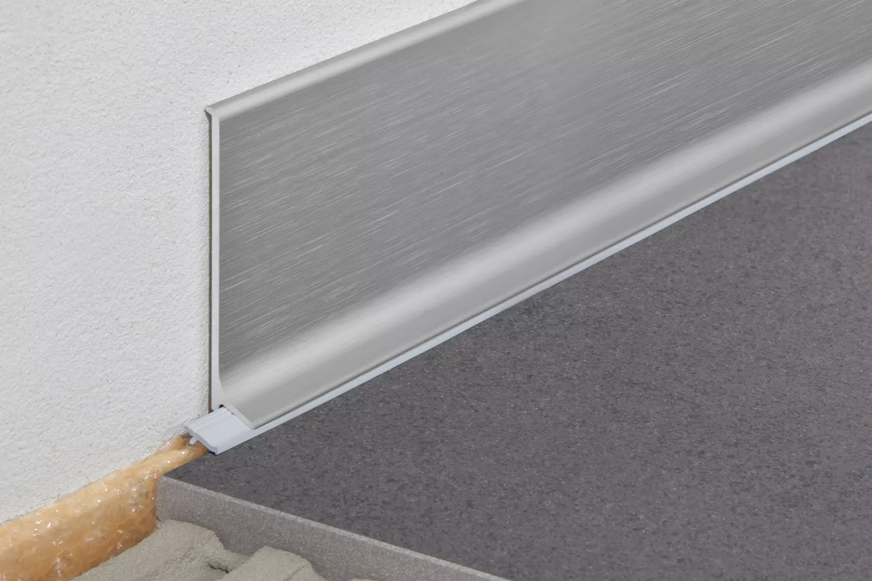 Schlüter-DESIGNBASE-SL-A aus farbig beschichtetem oder eloxiertem Aluminium ist in den Höhen 60 und 80 mm erhältlich.