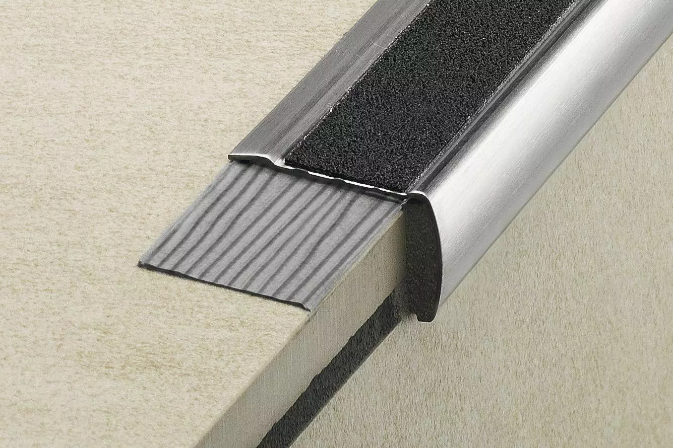 Die Treppenprofile schützen die Vorderkante der Stufen und bieten durch die rutschhemmende Ausführung der Auftrittsfläche und die optische Erkennbarkeit der Stufenkanten ein hohes Maß an Sicherheit. Die rutschhemmenden Bänder sind in der Vertiefung des Trägerprofils eingeklebt, wodurch die Kanten des Klebebandes zuverlässig geschützt werden.