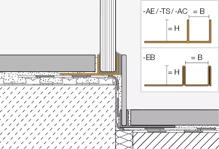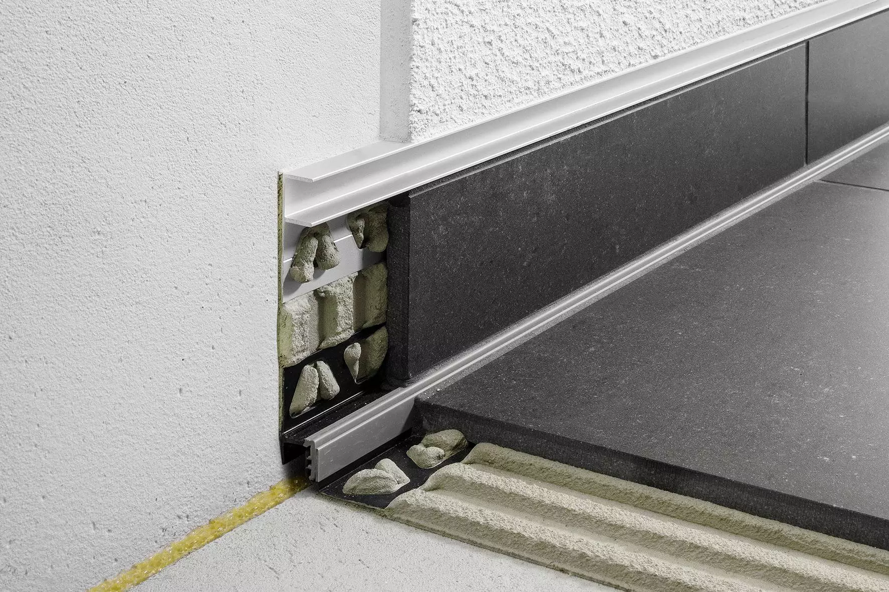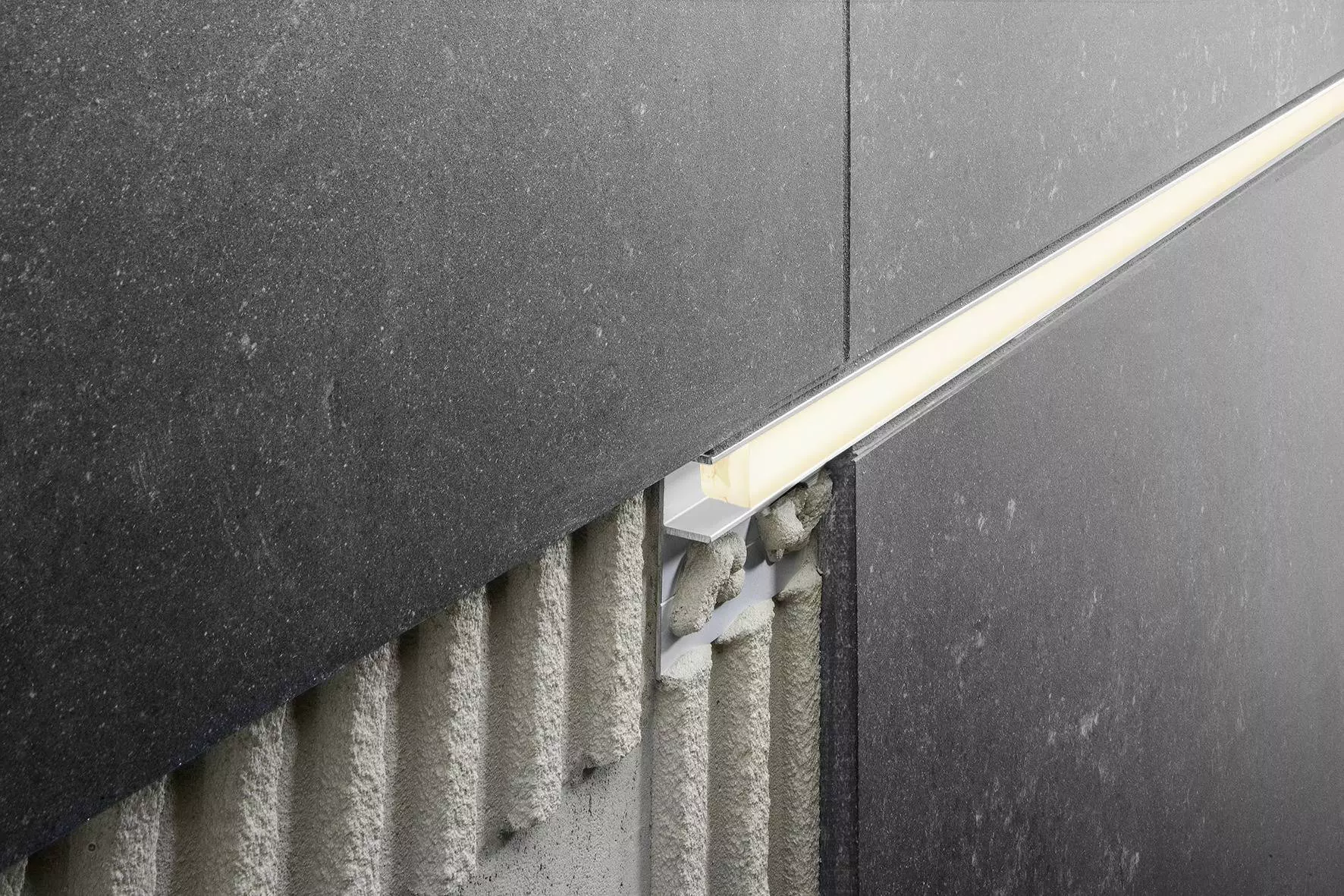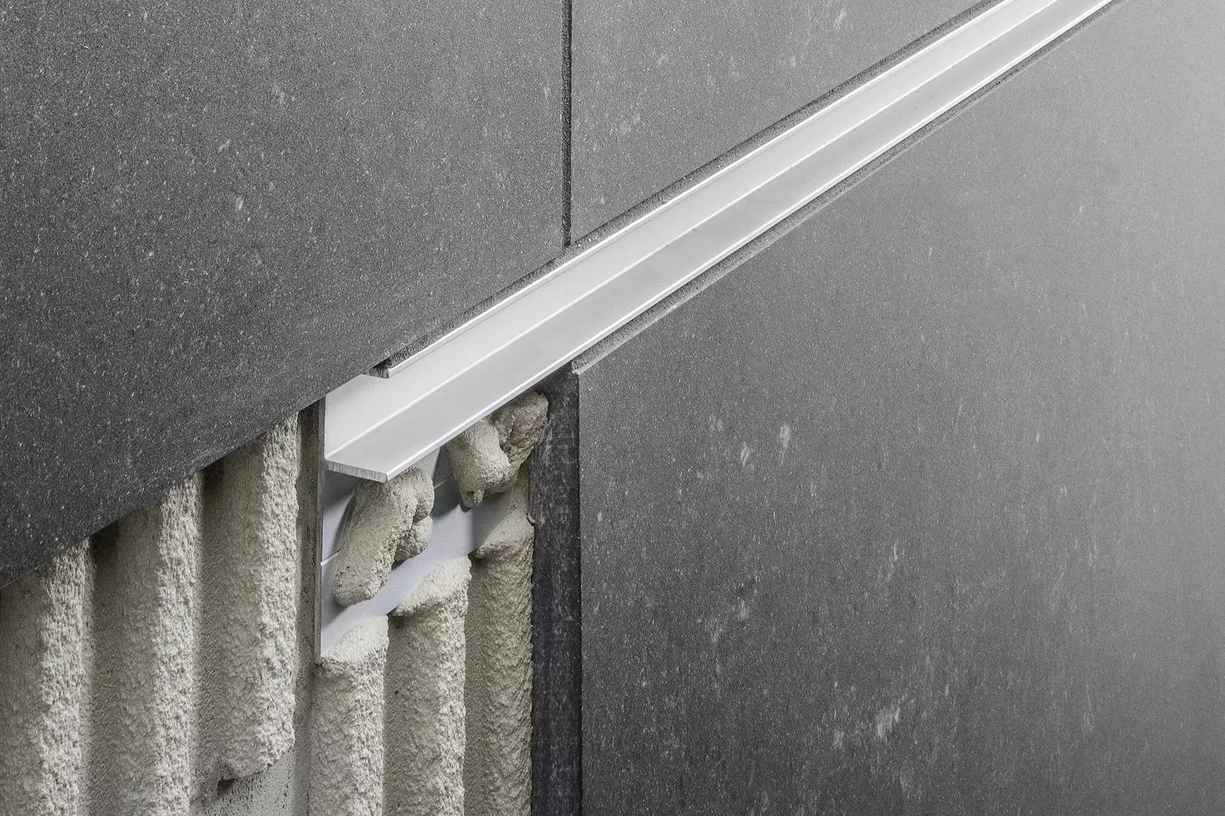 Anodised aluminium: The anodised layer provides the aluminium with a refined finish that remains unchanged in normal use. To protect visible surfaces from abrasion, immediately remove adhesive or grout from them and do not place foil over newly installed surfaces. Aluminium is sensitive to alkaline media. Cementitious materials become alkaline in combination with moisture. Depending on the concentration and exposure time, this may cause corrosion (aluminium hydroxide formation). Any cavities in which alkaline water can collect must therefore be avoided by ensuring that the profile and adjacent tiling are fully embedded in the setting material.