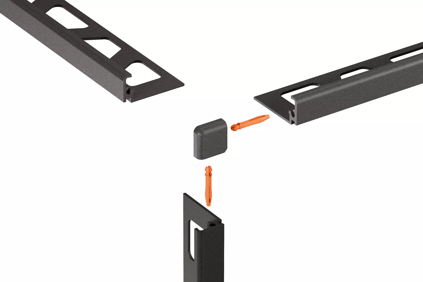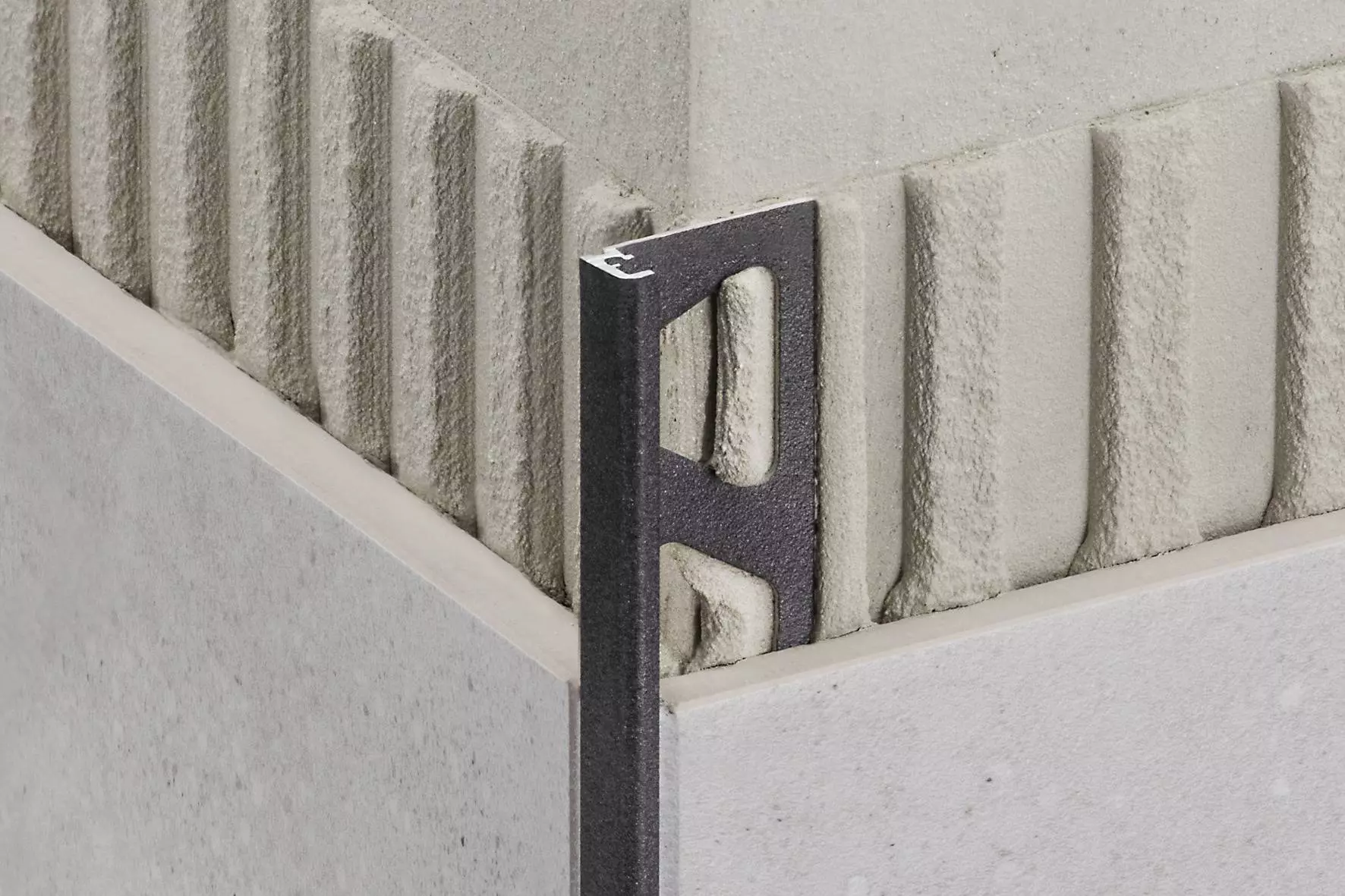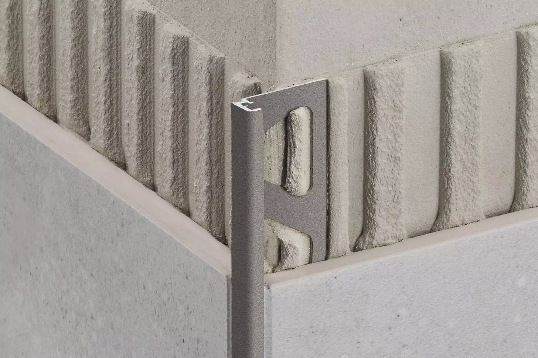 Schlüter-JOLLY-TS is a finishing profile with a 90 degree angle made of aluminium with a special textured coating. These decorative profiles create elegant and stylish external corners in tile coverings and finished edges of tiled skirtings and coverings. The joint spacers on both sides create a uniform grout joint with the tile. The geometric profile undercutting offers additional bonding surface for the grout.