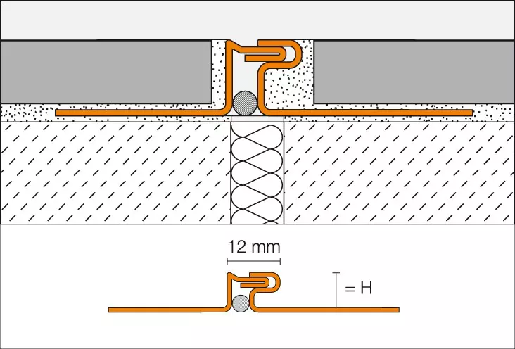 The movements of the covering assembly are absorbed by the flexible tongue and groove connection. In its base position, the visible width of the DILEX-EDP profile is 12 mm. Since the tongue and groove connection is unable to absorb height displacement, an insert to prevent vertical height displacement must be installed in the screed.