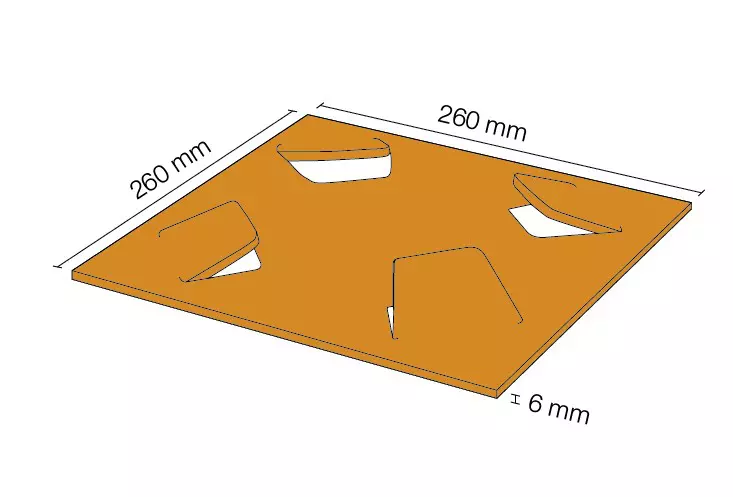 Schlüter-TROBA-LEVEL-PLS 6 is a granulated rubber pad on one side and aluminum lining on the other sideto protect the waterproofing assembly from damage. TROBA-LEVEL tile and paver supports are placed in the centre and secured in the slit cuts of the protective support pads for installation over the waterproofing assembly.