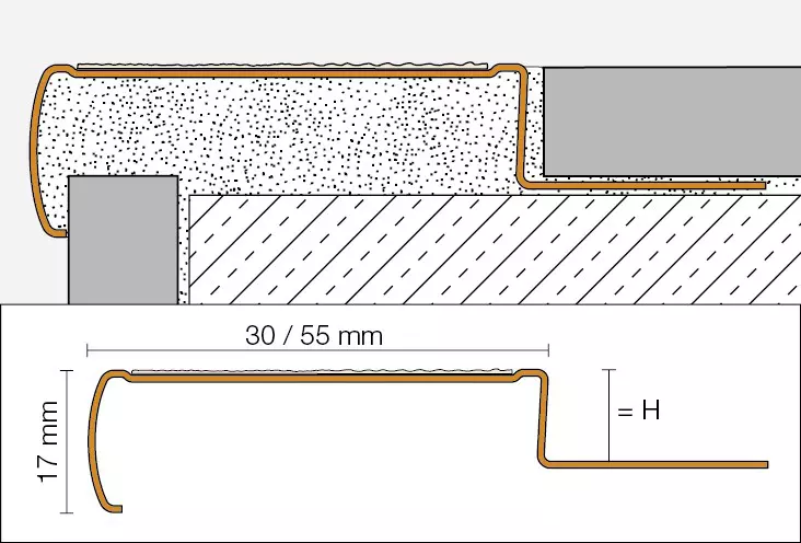 The profiles include an adhered non-slip tread: Schlüter-TREP-G/ -GK made of embedded mineral grit (R11), TREP-GL/ -GLK made of textured plastic (R10).