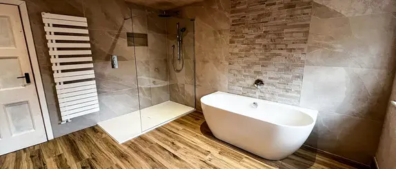 For functional and aesthetic purposes, a prefabricated Schlüter-KERDI-BOARD-N niche was installed. This was perfect for the client as they needed storage that was convenient whilst remaining stylish. In terms of installation, it was far from challenging as it was easily integrated into the Schlüter-KERDI waterproofing system as a bonded waterproofing assembly. Once the room was prepped for protection and ready to be finalised, 120 x 60 mm stone-effect porcelain tiles were fitted on the shower wall and behind the wash basin, with 120 x 20 mm wood-effect porcelain tiles on the floor.