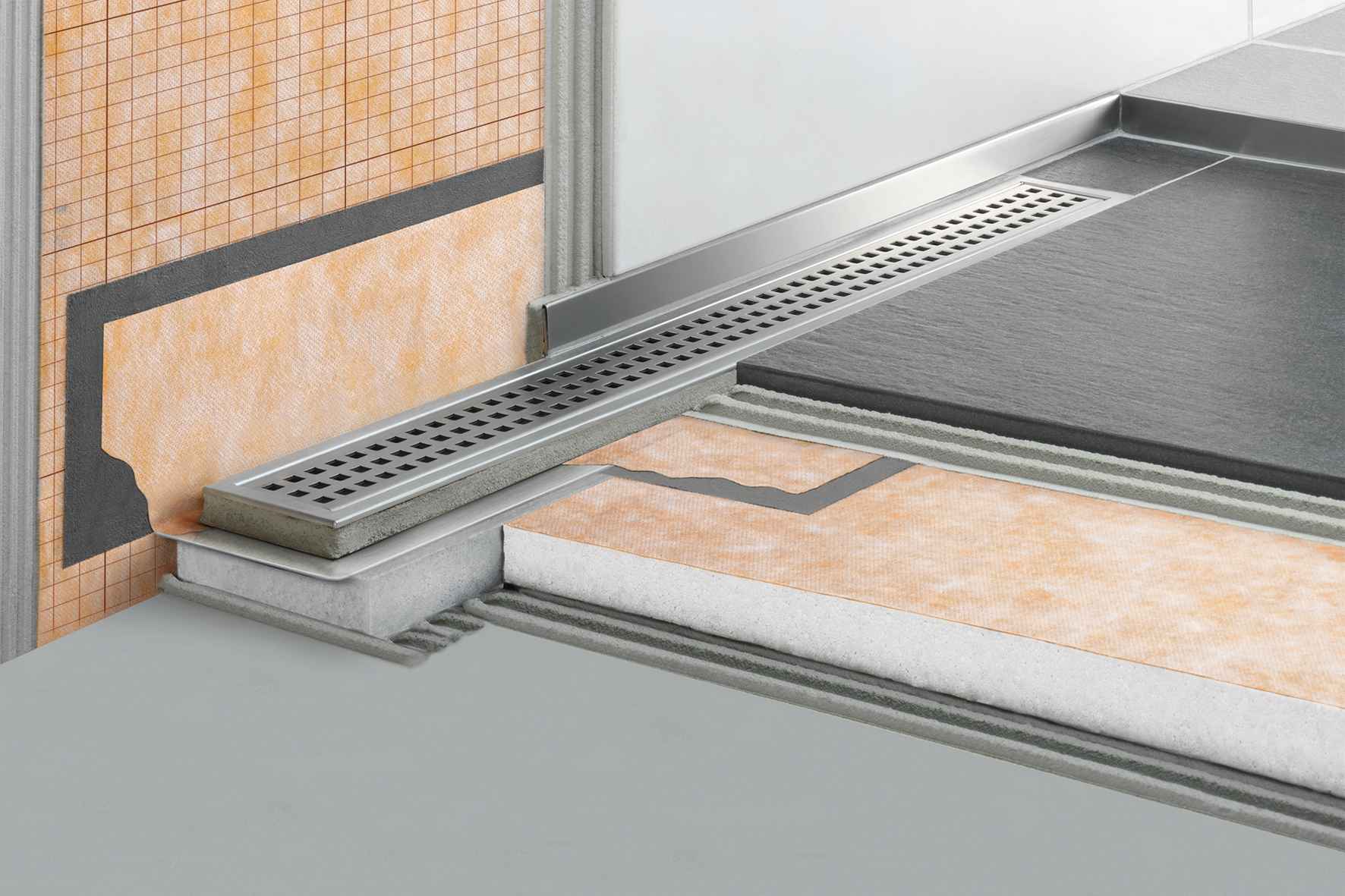KERDI-LINE-H and -V can be installed as a complete assembly with the matching sloped tray Schlüter-KERDI-SHOWER-L with integrated KERDI-waterproofing (see product data sheet 8.8). The installation of a sloped screed is possible as well. The surface of the screed must be waterproofed with Schlüter-KERDI (see product data sheet 8.1), DITRA (see product data sheet 6.1) or DITRA-HEAT (see product data sheet 6.4).