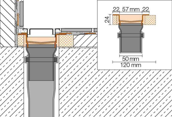 Schlüter-KERDI-LINE-V, -VS, -VOS for vertical drainage, e.g. to a floor level, are available either with an odour trap integrated in the drain body (KERDI-LINE-V) or with a trap section (KERDI-LINE-VS) – including with an off-centre drain (KERDI-LINE-VOS).