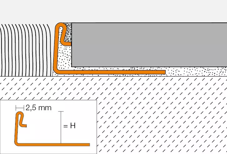 Schlüter-SCHIENE-ES is made of roll formed V2A stainless steel (material no. 1.4301). The profile structure therefore varies slightly from the extruded brass and aluminium versions. SCHIENE-ES is highly durable and especially suited for application areas that must be resistant to chemicals and acids, such as the food industry, breweries, dairies, industrial kitchens, and hospitals.