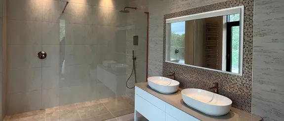 Tucked away in a beautiful town in Shropshire, overlooking the River Severn, sits a newly built three story residential property. The home consists of several impressive features, including a cinema room, the open plan kitchen with its feature island which sits at approximately 6m long, and a home spa. Each of the five bedrooms benefit from large open plan ensuite bathrooms, with individual designs and colour schemes giving them all their own unique look. A total of seven bathrooms have been installed, including a swimming pool changing area. Not just in the bathrooms, but throughout the home, a range of Schlüter products have been used: from tile edge protecting trims, to shower drainage and waterproofing.