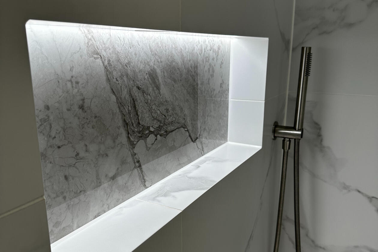 For added stunning touches, the modern LED-technology Schlüter-LIPROTEC was used in the form of prefabricated niches, with Chris adding an extra LED strip so that both shelves were illuminated. Chris also created a feature by running LIPROTEC around the bottom of the walls.