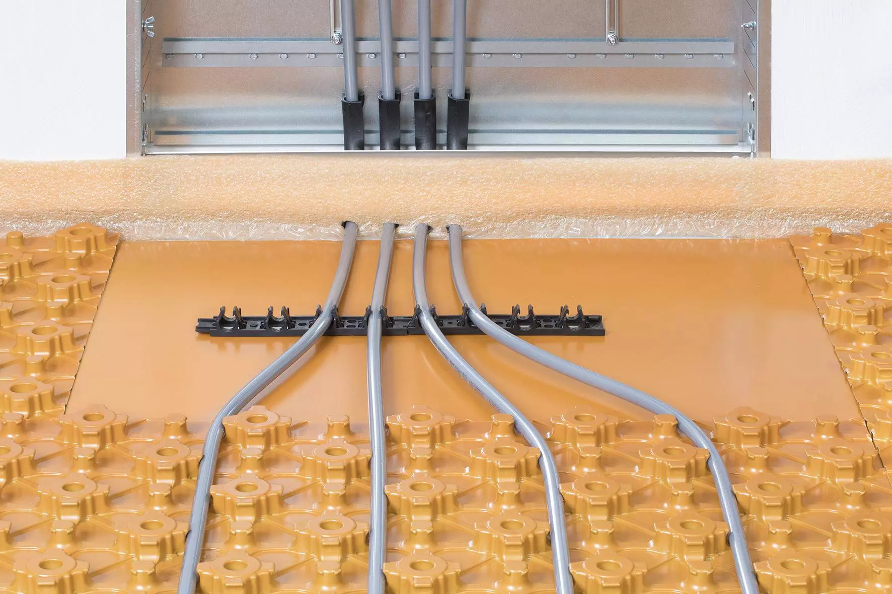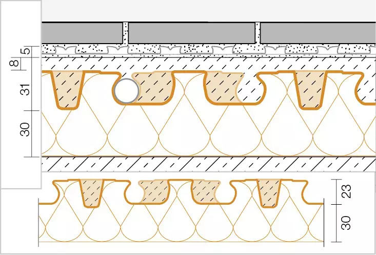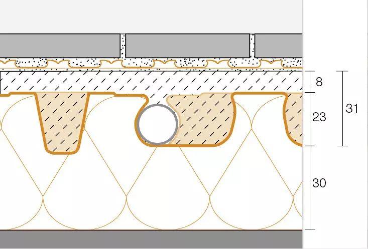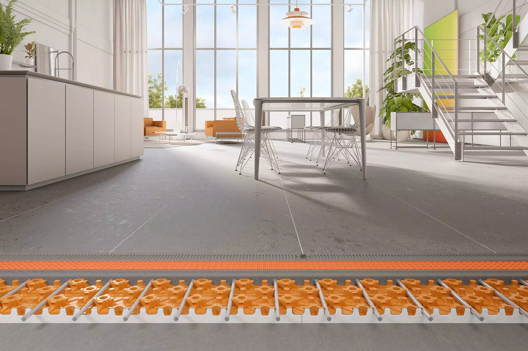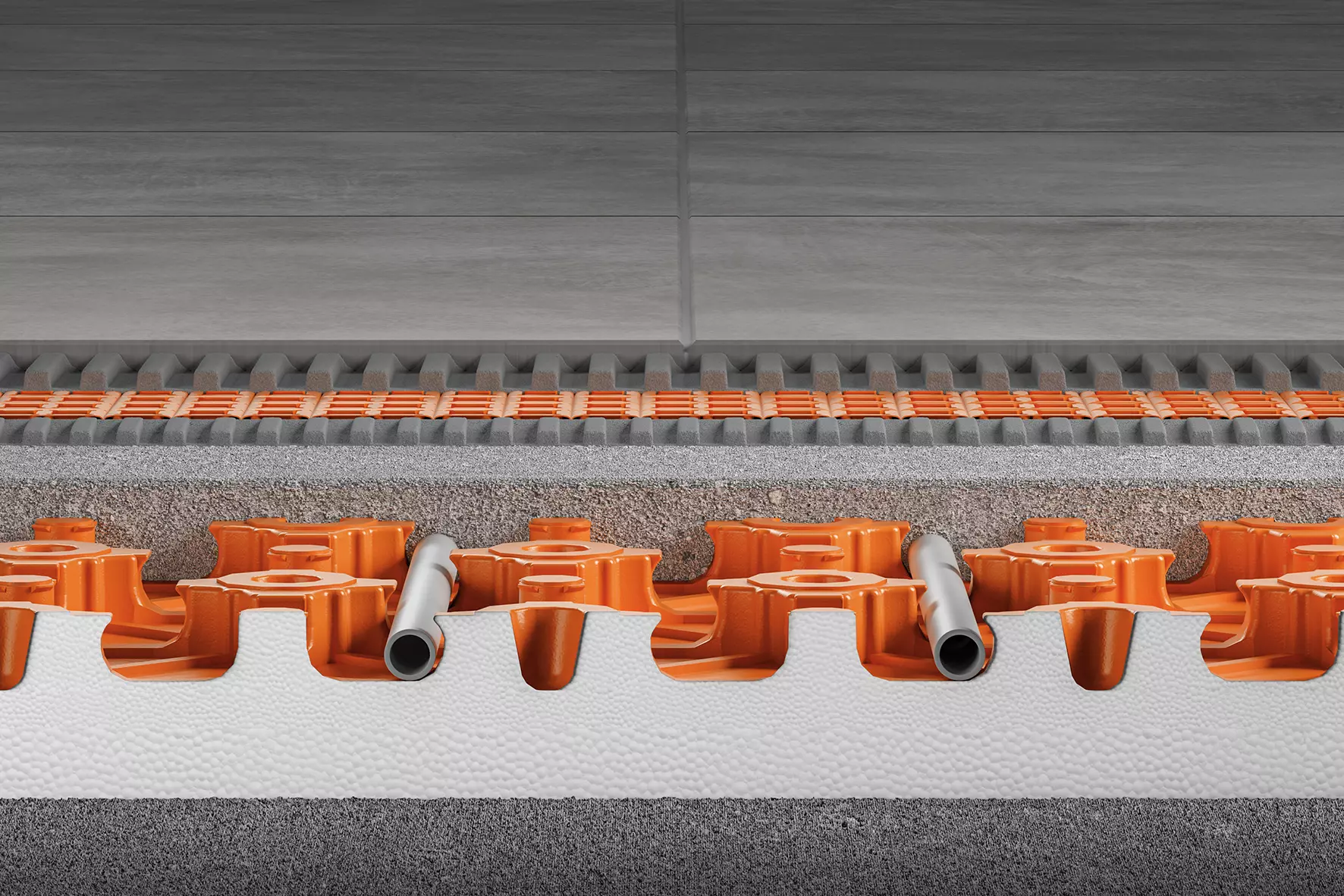 The system is based on the studded screed foil panel Schlüter-BEKOTEC-EN-23 FI-30, which is foam-backed with heat and sound insulation made of polystyrene (EPS) and can be directly installed on top of a load-bearing substrate or also over conventional heat insulation panels.