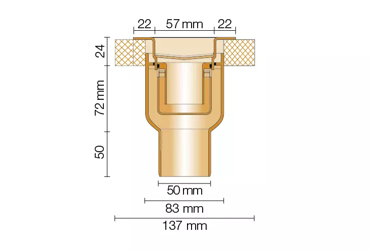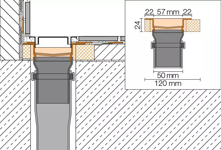 Schlüter-KERDI-LINE-V, -VS, -VOS pour évacuation verticale, par exemple à travers la dalle à l'étage, sont équipés soit d'un siphon intégré dans un corps de siphon (KERDI-LINE-V) soit d'un siphon-tube (KERDI-LINE-VS) - ou avec évacuation excentrée (KERDI-LINE-VOS).