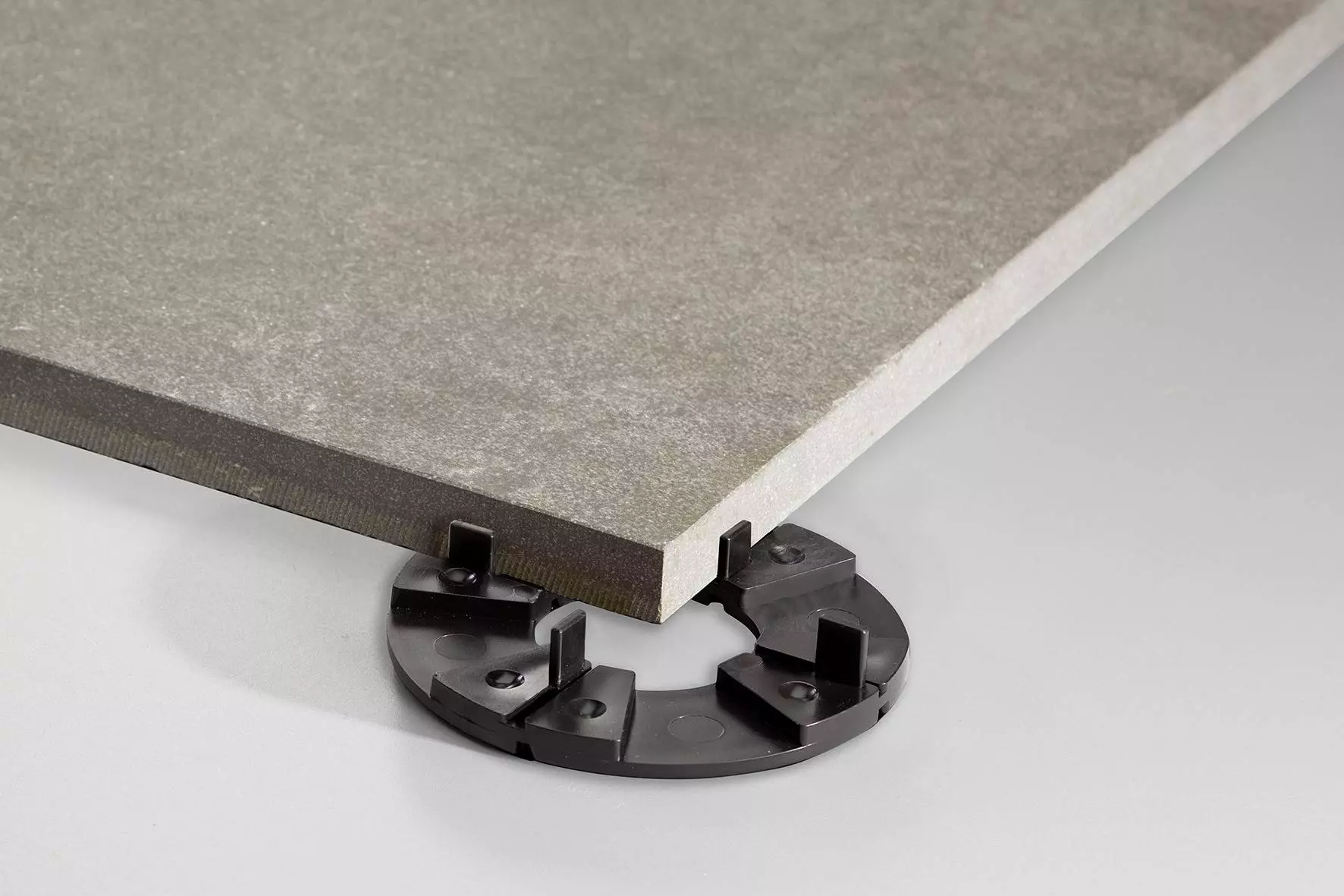 - Les supports de dalles TROBA-LEVEL-LV 3 (ø 200 mm, hauteur 3 mm), combinables avec des supports de dalles TROBA-LEVEL-PL 10 et TROBA-LEVEL-PLA 30, peuvent être utilisés en complément pour la répartition des charges. Les supports de dalles TROBA-LEVEL-LV 3 permettent également de réaliser des structures avec des hauteurs réduites – la mise à niveau précise s'effectue au moyen des cales de compensation TROBA-LEVEL-AP 1. TROBA-LEVEL-LV 3 est recoupable et possède des écarteurs de 3 mm d'épaisseur qui permettent de garantir des joints réguliers.