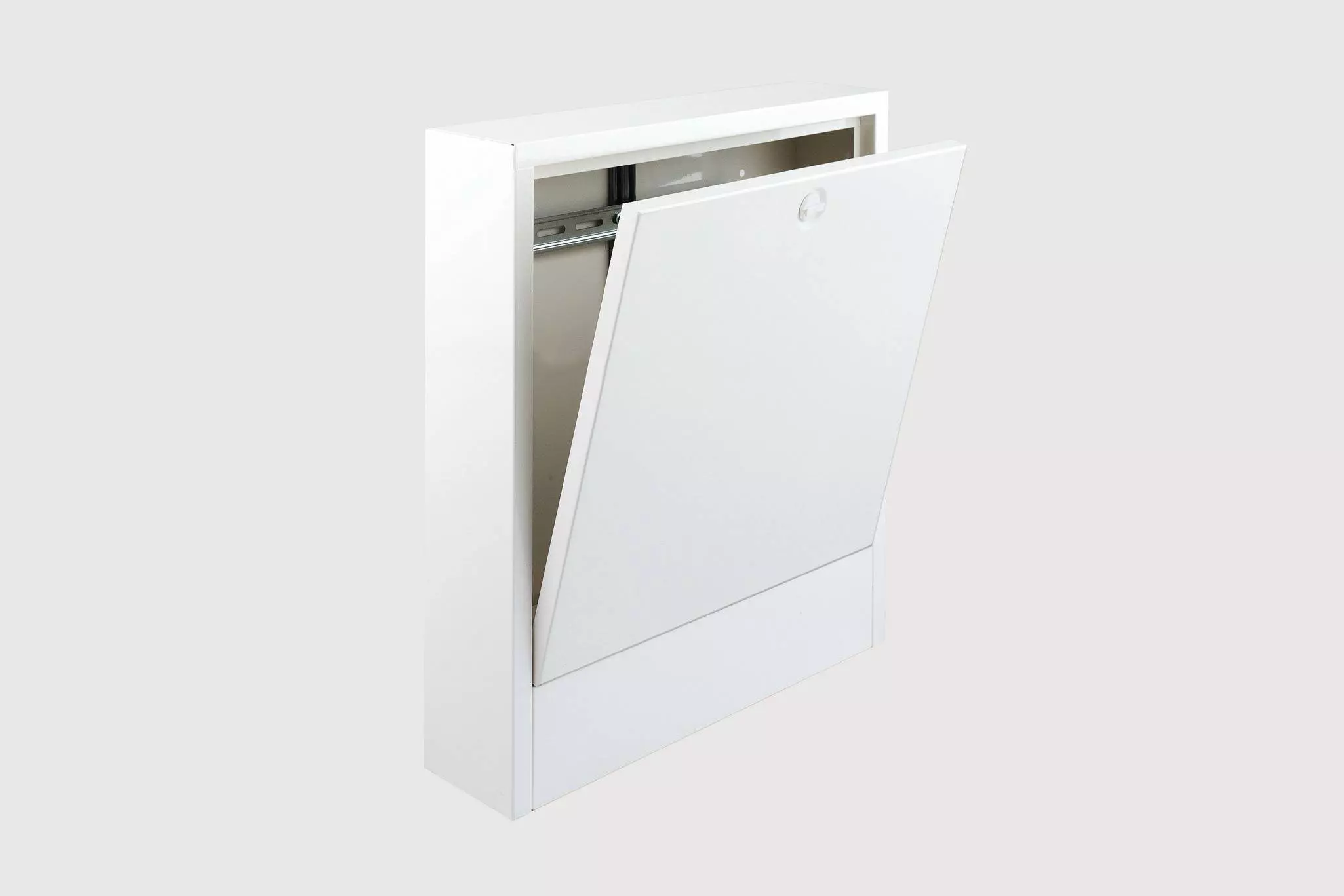 Si vous préférez un coffret pour collecteur avec montage en applique ou que les conditions d'installation ne permettent pas un montage encastré, nous recommandons Schlüter-BEKOTEC-THERM-VSV. Celui-ci permet de ranger entièrement tous les collecteurs de circuits de chauffage Schlüter ainsi que les composants de régulation correspondants. Le coffret pour collecteur est en tôle d’acier galvanisée avec finition laquée à l’intérieur et à l’extérieur.