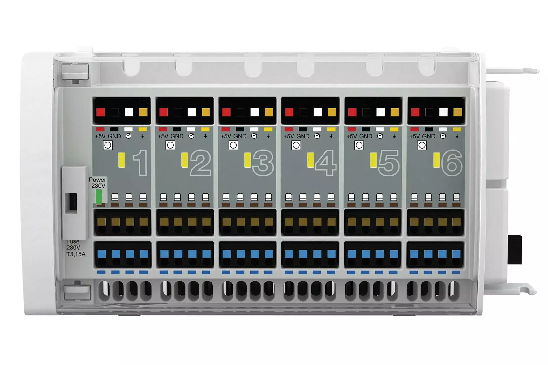 A két kivitelben, 2 vagy 6 helyiségérzékelőhöz kínált Schlüter-BEKOTEC-THERM-EAR csatlakozómodul a Schlüter-BEKOTEC-THERM-ER vezetékes termosztátjaink és a Schlüter-BEKOTEC-THERM-ESA, valamint Schlüter-BEKOTEC-THERM-EAHB állítóműveink összekapcsolására szolgál.