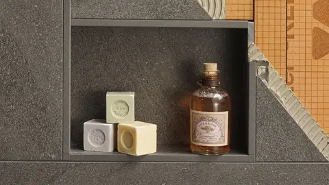 Un altro punto importante per la famiglia: una doccia a filo pavimento che offre spazio sufficiente e rappresenta un vero e proprio punto di forza del bagno. In questo caso, Müller ha scelto un sistema di scarico lineare KERDI-LINE con un supporto di copertura piastrellabile, creando così un sistema di scarico discreto che richiama il rivestimento. Il profilo Schlüter-DECO-SG coordinato è stato utilizzato per inserire la parete in vetro. Anche la nicchia per shampoo e bagnoschiuma non passa inosservata: è illuminata da un profilo DESIGNBASE QD, installato nella parte superiore della nicchia.