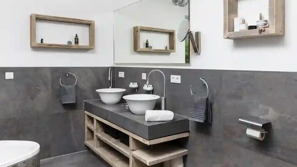 La famiglia non deve preoccuparsi dei piedi freddi nemmeno nella spaziosa zona lavabo. Michèl Müller ha collaborato con un amico falegname per creare un pezzo davvero unico. Il piano lavabo rivestito con piastrelle e largo 180 cm, offre spazio per due lavabi, mentre la mensola sottostante, realizzata con vecchie tavole da impalcatura recuperate, non è solo un elemento di richiamo visivo, ma anche un ampio spazio per riporre gli oggetti. Lo specchio sovrastante si estende per tutta la larghezza del piano lavabo ed è illuminato indirettamente grazie al profilo illuminato Schlüter-LIPROTEC-WS. “Questa illuminazione ambiente può essere utilizzata per creare un'atmosfera piacevole, soprattutto nei momenti di relax”, spiega Müller. Ad esempio, quando un membro della famiglia si gode un bagno nell'accogliente vasca. Con la sua forma arrotondata e curva e la sua libera collocazione nella stanza, la vasca invoglia a rilassarsi e, incorniciata da un suggestivo mosaico, si inserisce perfettamente nel bagno moderno in stile cemento anche dal punto di vista cromatico.