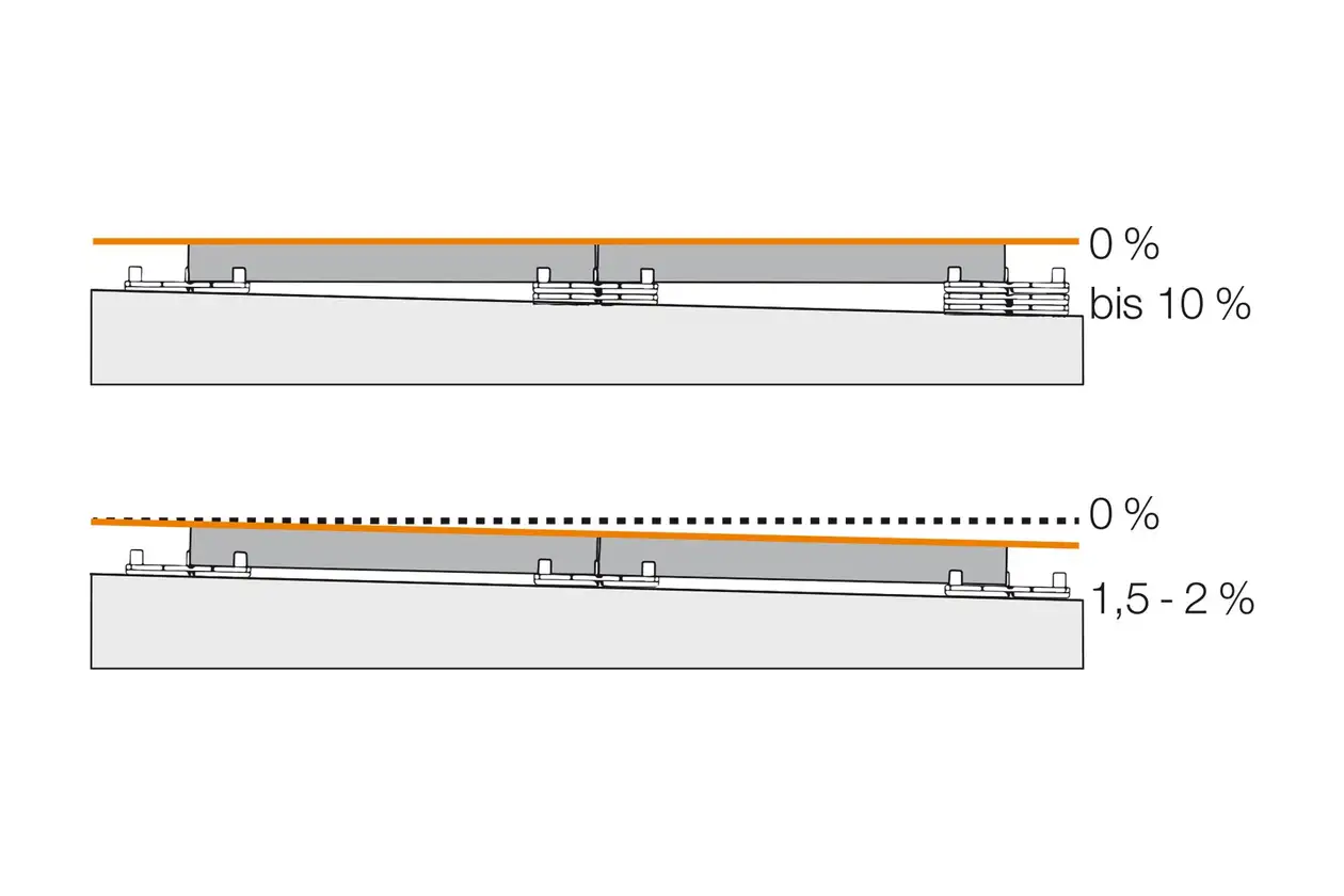 Con questo tipo di posa, le lastre poggiano su supporti regolabili in altezza e sovrapponibili, mentre i sistemi costruttivi sono in genere costituiti da vari elementi combinabili tra loro. I componenti premontati di Schlüter-TROBA-LEVEL possono essere combinati tra di loro in modo flessibile per ottenere altezze di installazione a partire da 3 mm a oltre 1 metro. In questo modo è possibile livellare praticamente qualsiasi pendenza dallo 0 al 10%: un vantaggio davvero notevole se il sottofondo ha variazioni di livello. Tutti gli elementi vengono inseriti o ruotati all'altezza desiderata senza bisogno di attrezzi speciali.