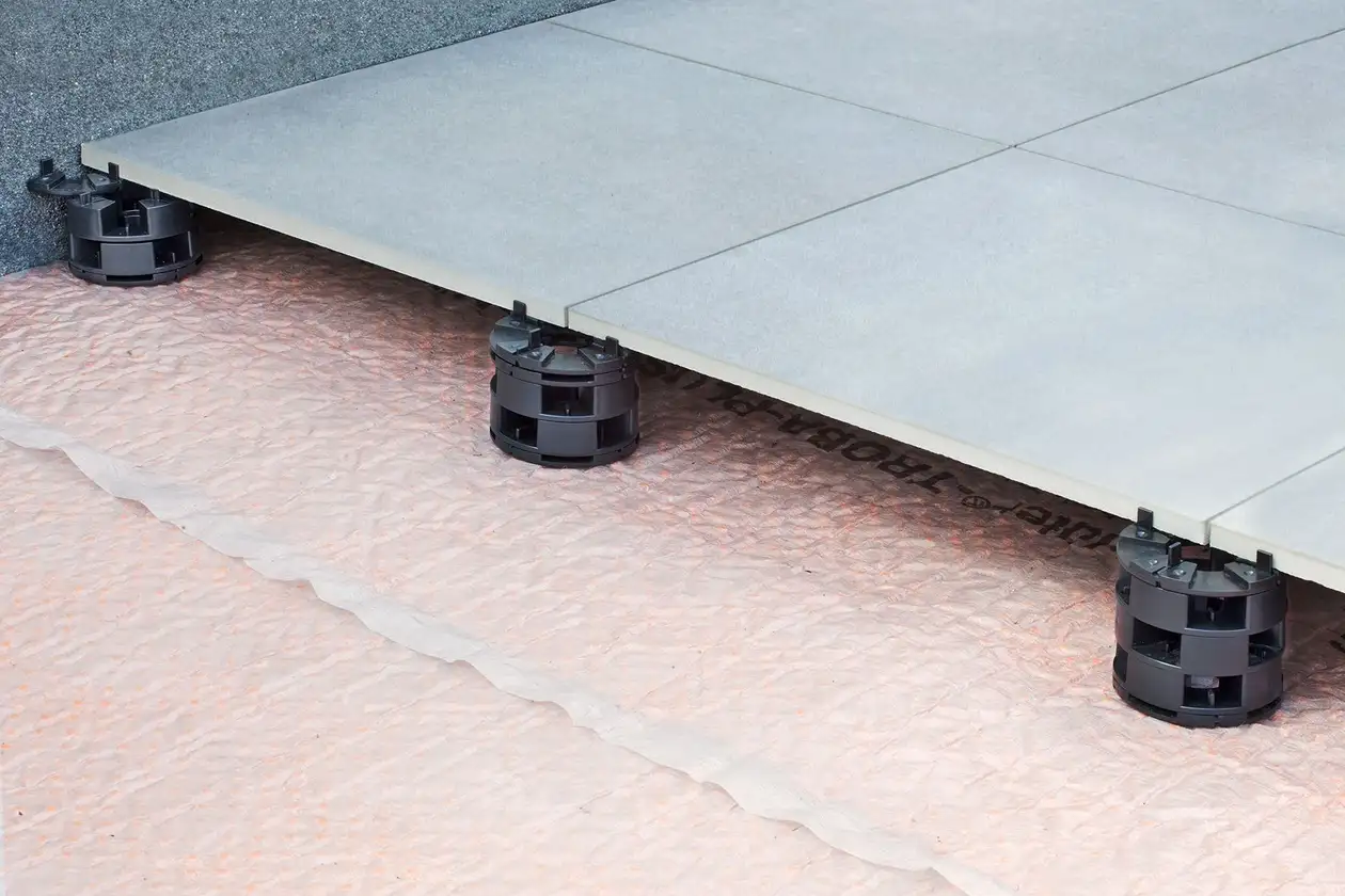 Grazie alle fughe aperte tra le lastre, il rivestimento finito può drenare verso l’impermeabilizzazione del terrazzo, dotato di pendenza appropriata. Grazie al suo design, questo sistema di posa garantisce una microventilazione costante sotto il rivestimento, prevenendo i danni causati dal gelo. La sostenibilità prima di tutto: in caso di riparazioni o ristrutturazioni, le lastre possono essere facilmente rimosse in qualsiasi momento e i componenti del sistema riutilizzati.