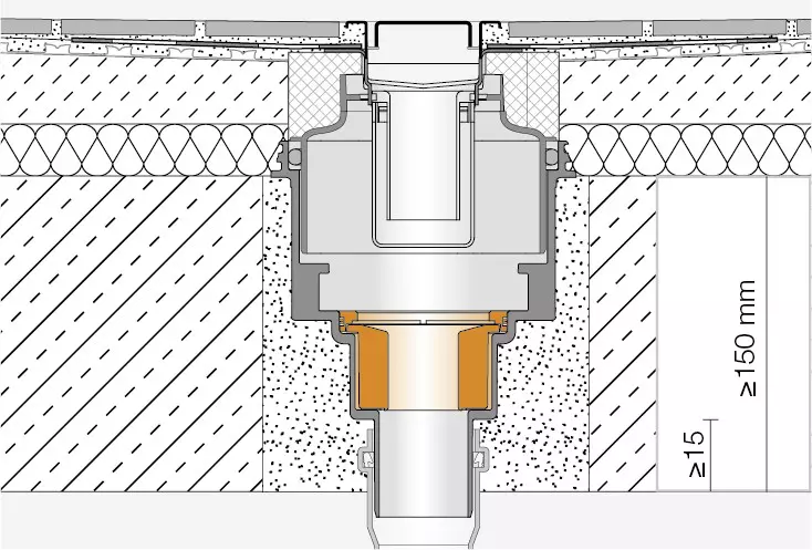 I componenti del sistema impediscono la diffusione dell’incendio in altri piani e hanno un’omologazione Z-19.17-1719. L’innesto antincendio (Art.-Nr.: KL BS) viene inserito nel corpo di scarico del set di scarico lineare KERDI-LINE-V 50 G2.