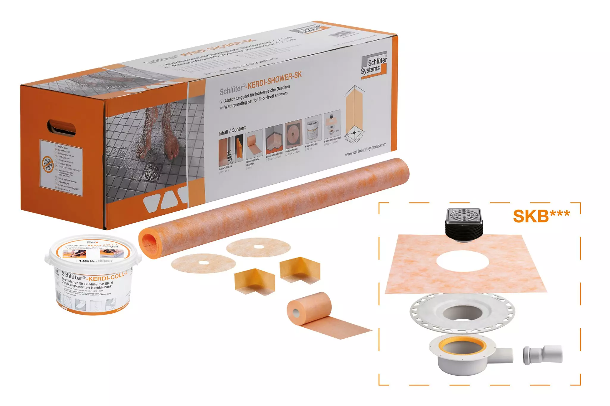 Schlüter-KERDI-SHOWER-SK è un kit completo per l’impermeabilizzazione di docce a filo pavimento. Nel kit Schlüter-KERDI-SHOWER-SK sono inclusi: Schlüter-KERDI (guaina per l’impermeabilizzazione delle pareti nella zona doccia) e pezzi speciali per l’impermeabilizzazione di punti critici come angoli e tasselli di tenuta per tubature. La fornitura comprende anche la fascetta impermeabilizzante Schlüter-KERDI-KEBA per le giunzioni tra i teli e negli angoli tra pavimento/parete e il collante impermeabilizzante Schlüter-KERDI-COLL-L.