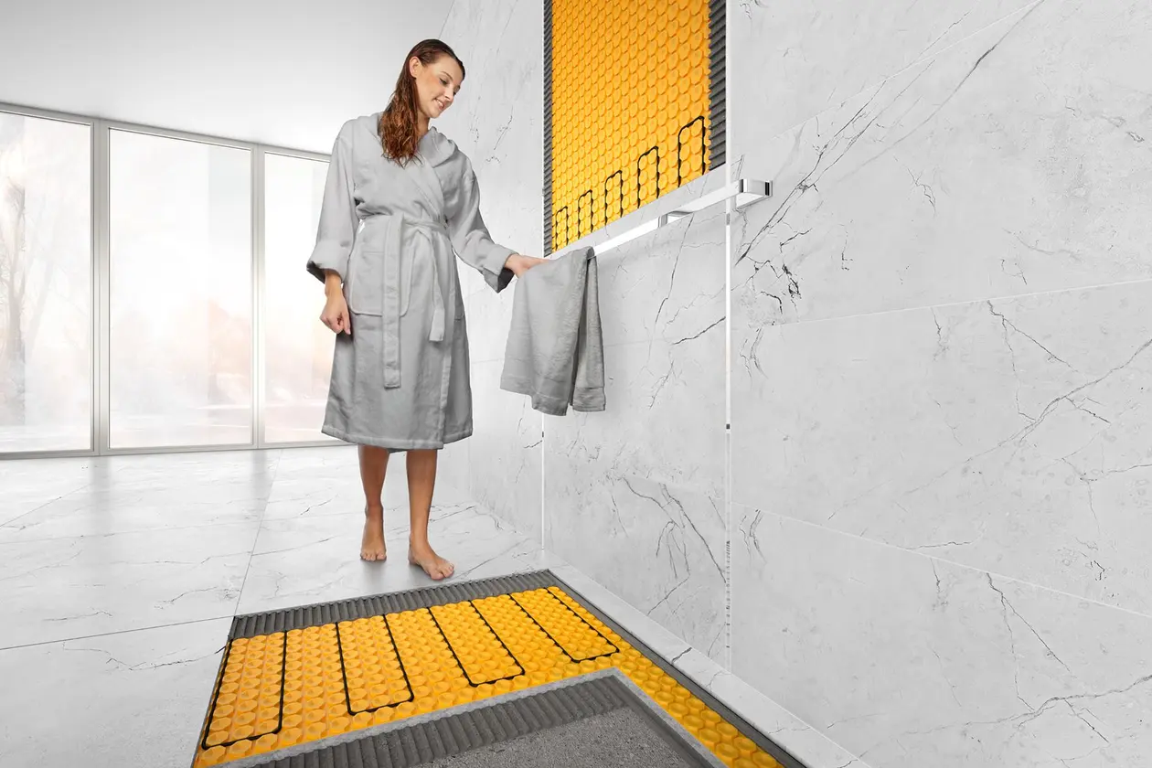 In het wandoppervlak van de douche werd de wandverwarming DITRA-HEAT-E geïnstalleerd. Deze zorgt voor aangename warmte en tegelijkertijd voor snelle droging van de tegels.