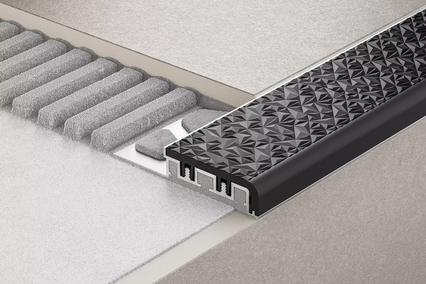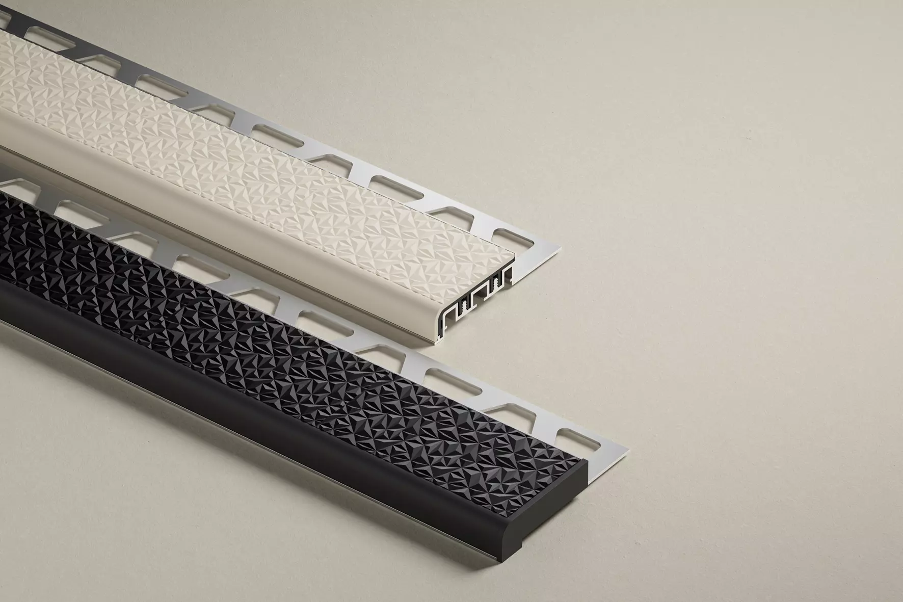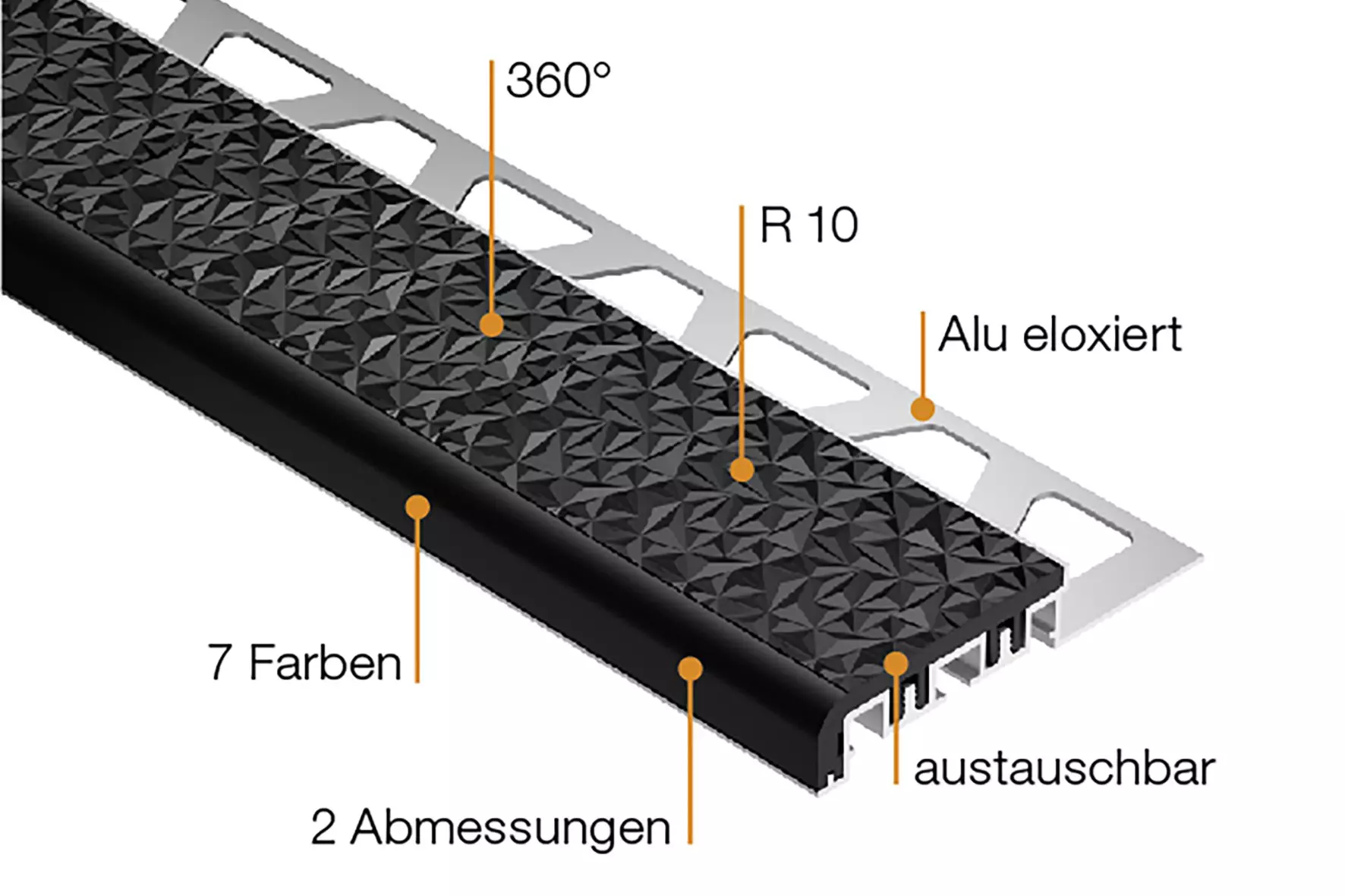 Schlüter-TREP-V bestaat uit een aluminium draagprofiel en een ingeklemd loopvlak met een onderzijde van hard-PVC en een antislipbovenzijde met speciaal reliëf van zacht-PVC.