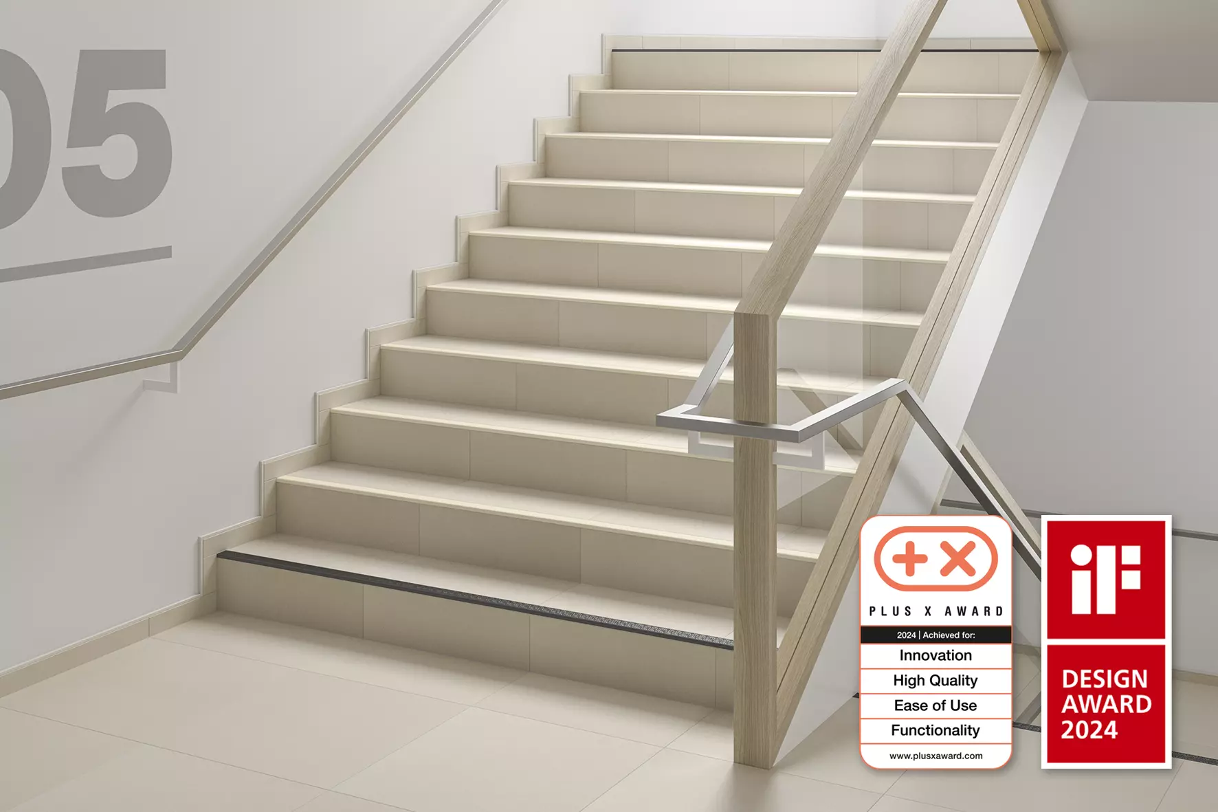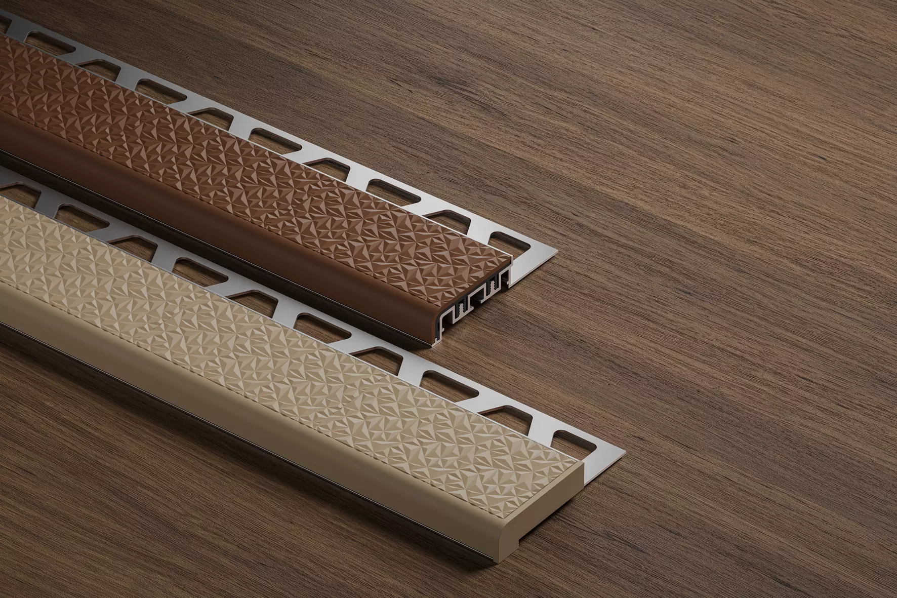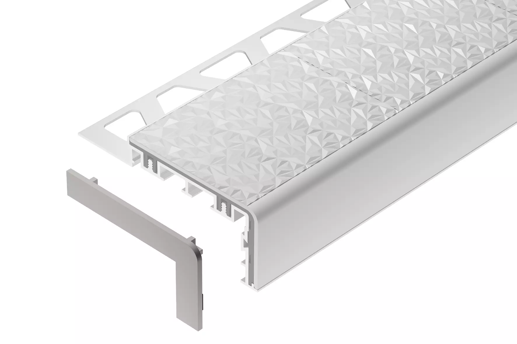 Schlüter-TREP-V bestaat uit een aluminium draagprofiel en een ingeklemd loopvlak met een onderzijde van hard-PVC en een antislipbovenzijde met speciaal reliëf van zacht-PVC.