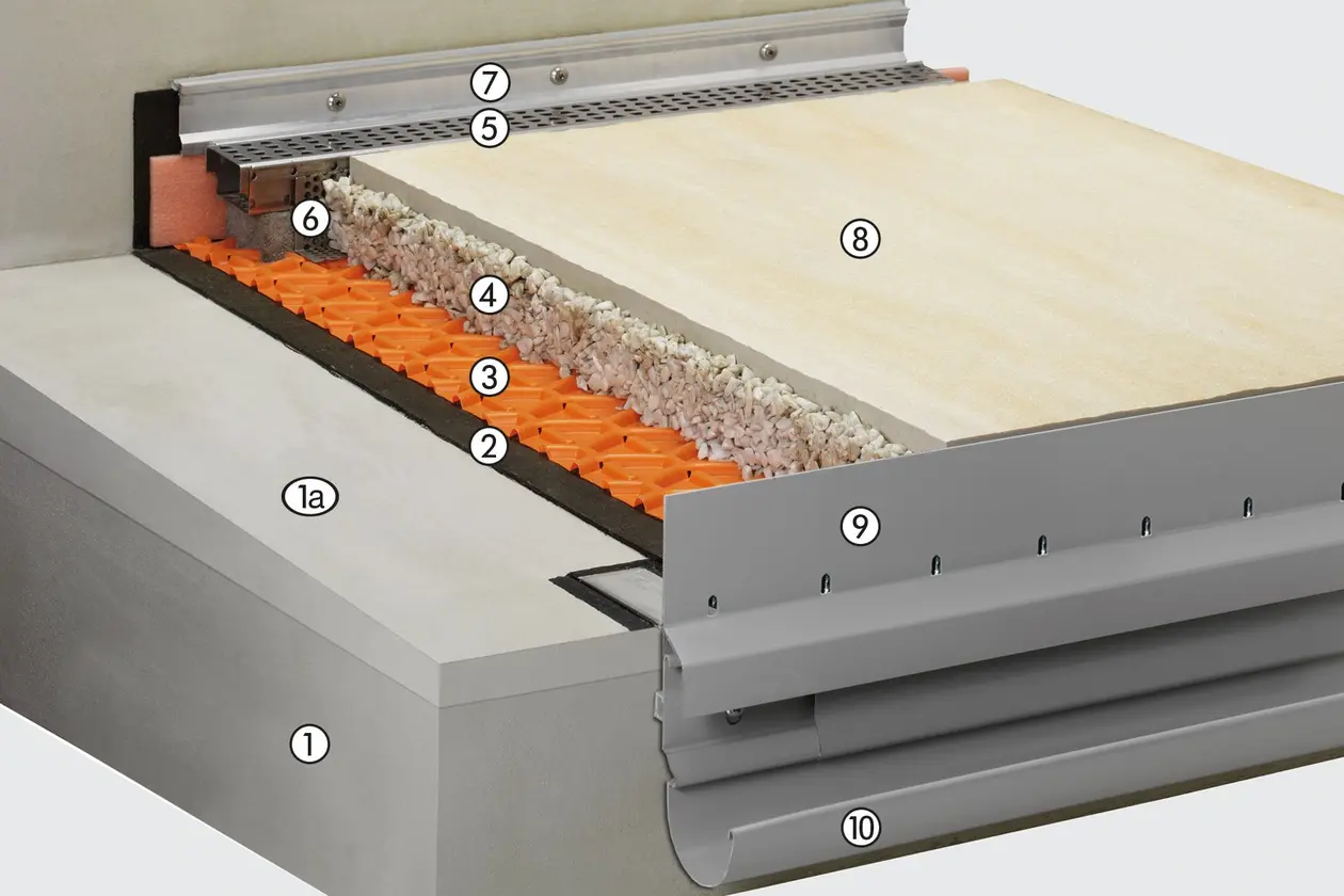 W przypadku takiego wykonania balkonu lub tarasu na dachu, konstrukcja nośna musi być zabezpieczona przed wnikaniem wody za pomocą hydroizolacji zgodnie z normą DIN 18531. Jako warstwa ochronna lub oddzielająca służy Schlüter-TROBA między hydroizolacją a podsypką: chroni ona hydroizolację przed uszkodzeniem mechanicznym i jednocześnie zapewnia szybkie i skuteczne odprowadzanie wody, co chroni przed oblodzeniem.