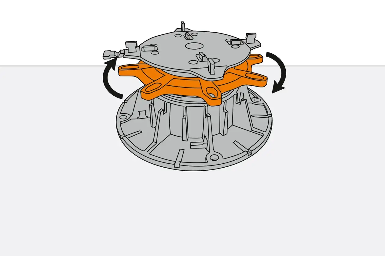 W przypadku tego sposobu montażu płyty leżą na wspornikach o regulowanej wysokości, które można układać jeden na drugim. Systemy konstrukcyjne składają się zazwyczaj z różnych elementów, które można ze sobą łączyć. Również zmontowane wstępnie elementy Schlüter-TROBA-LEVEL można łączyć ze sobą dowolnie, co pozwala na uzyskanie wysokości od 3 mm do ponad 1 m. Umożliwia to zniwelowanie niemal każdego spadku od 0% do 10%. co jest niezwykłym atutem w przypadku braku równego podłoża. Wszystkie elementy wkłada się i obraca na wymaganą wysokość bez specjalnych narzędzi.
