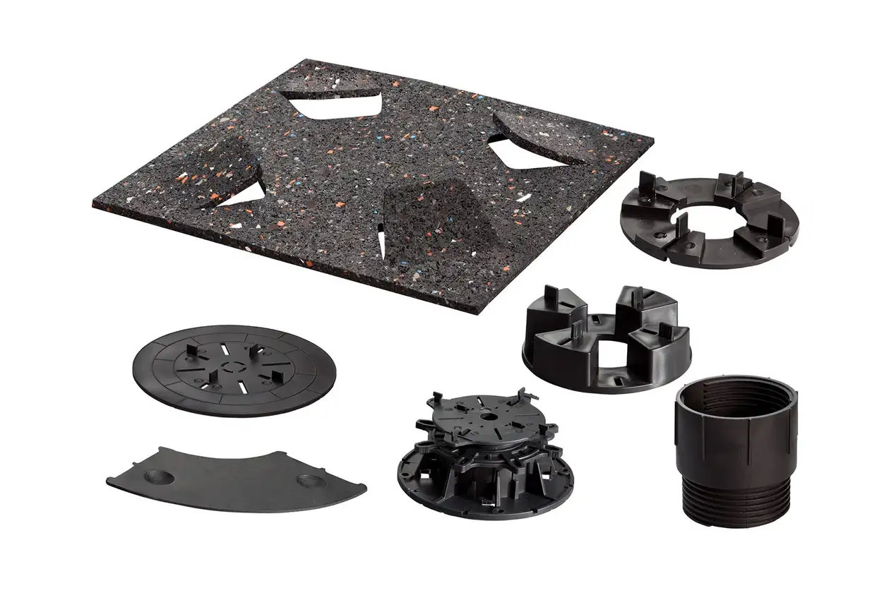 Wszystkie komponenty są wykonane ze specjalnego tworzywa sztucznego, które ma właściwości wygłuszające i jest odporne na czynniki atmosferyczne, a także przemieszczanie w poziomie i obciążenia. Podkładki rozkładające obciążenie i maty ochronne zapobiegają uszkodzeniu podłoża. W przypadku przebudowy produkty można łatwo zdemontować i wykorzystać ponownie.
