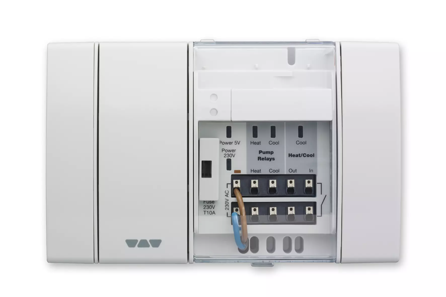 Os módulos de ligação para os reguladores de temperatura ambiente por cabo e por radiofrequência (Schlüter-BEKOTEC-THERM-EAR e Schlüter-BEKOTEC-THERM-EAR-WL) podem ser ligados ao módulo básico “Controlo” do Schlüter-BEKOTEC-THERM-EBC e alimentados com energia. Também é possível uma instalação mista de ambos os módulos de ligação. Os sensores de ambiente conectados por cabo são alimentados com baixa tensão (DC 5 V (SELV)) através dos respetivos módulos de ligação. As eletroválvulas ligadas são controladas com corrente alternada de 230 V. Particularmente prático: o estado de funcionamento e o fornecimento de tensão podem ser claramente lidos através dos LEDs.