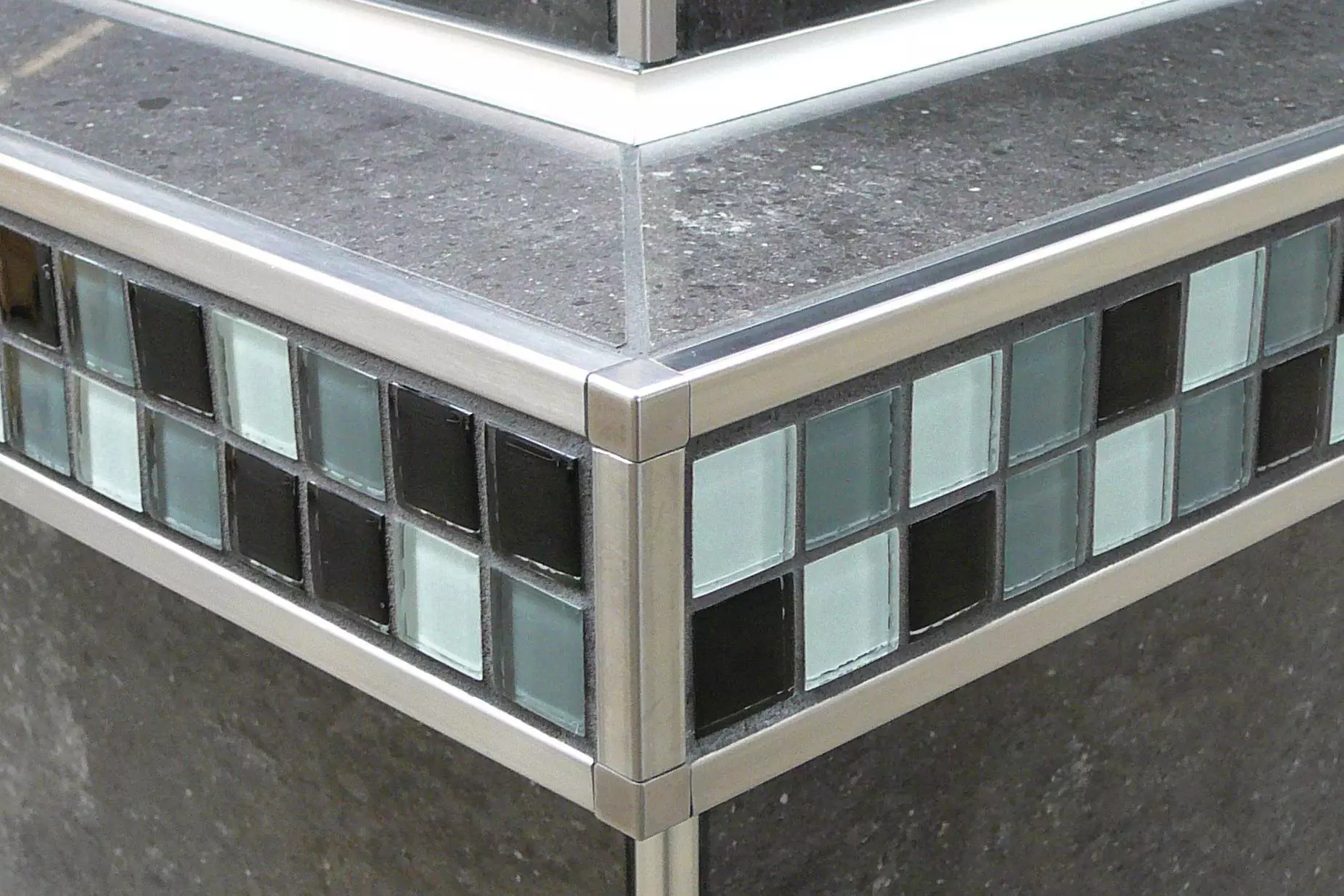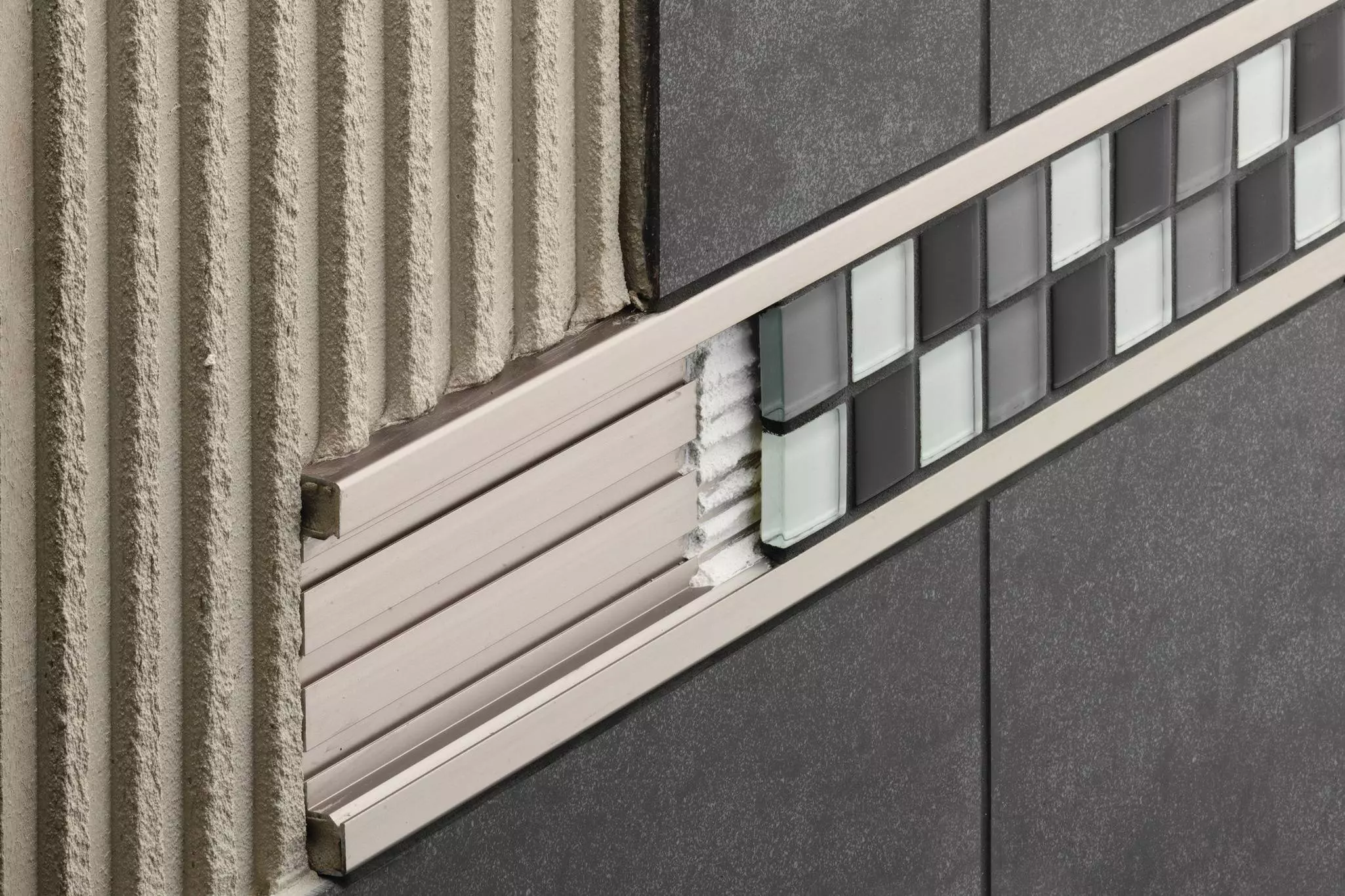Schlüter-QUADEC-FS é composto por alumínio revestido com diferentes superfícies anodizadas.