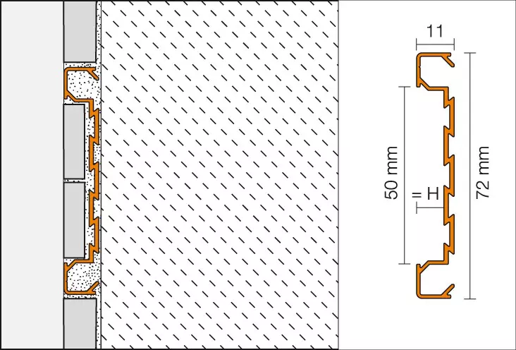 Verificar a aplicabilidade de Schlüter-QUADEC-FS, sempre que for previsível um posterior contacto com produtos químicos. O alumínio é sensível a meios alcalinos. Os materiais à base de cimento desenvolvem propriedades alcalinas sob a ação da humidade, podendo dar origem à corrosão (formação de hidróxido de alumínio), dependendo da concentração e do tempo de atuação. Daí ser necessário remover de imediato a argamassa ou o material para juntas das superfícies visíveis. O perfil deverá estar em contacto com a cerâmica em toda a sua superfície.