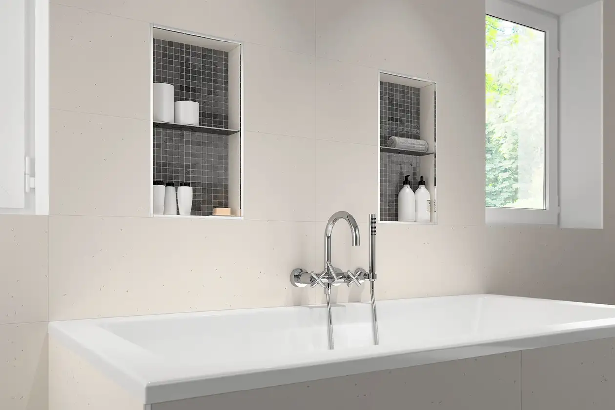 Doğru yerlere entegre edilen nişler veya raflar banyoda karmaşık olmayan bir düzen yaratır ve değerli saklama alanları yaratır; özellikle küçük mekanlarda. Aynı zamanda malzeme seçimi, düzen veya aydınlatma bakımından istenen atmosferin yaratılması için mükemmel bir tasarım öğesi oluştururlar.