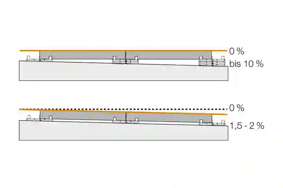 Bitmiş kaplama, açık kalan derzlerin arasından geçerek terasın uygun şekilde tasarlanmış yalıtım düzlemi üzerinden tahliye sağlar. Bu döşeme konstrüksiyona bağlı olarak kaplamanın sürekli alttan havalandırılmasını sağlar ve bu da donma hasarlarını engeller. Özellikle sürdürülebilir: Bir onarım veya bir tadilat durumunda teras plakaları her zaman sorunsuz bir şekilde alınabilir ve sistem bileşenleri tekrar kullanılabilir.