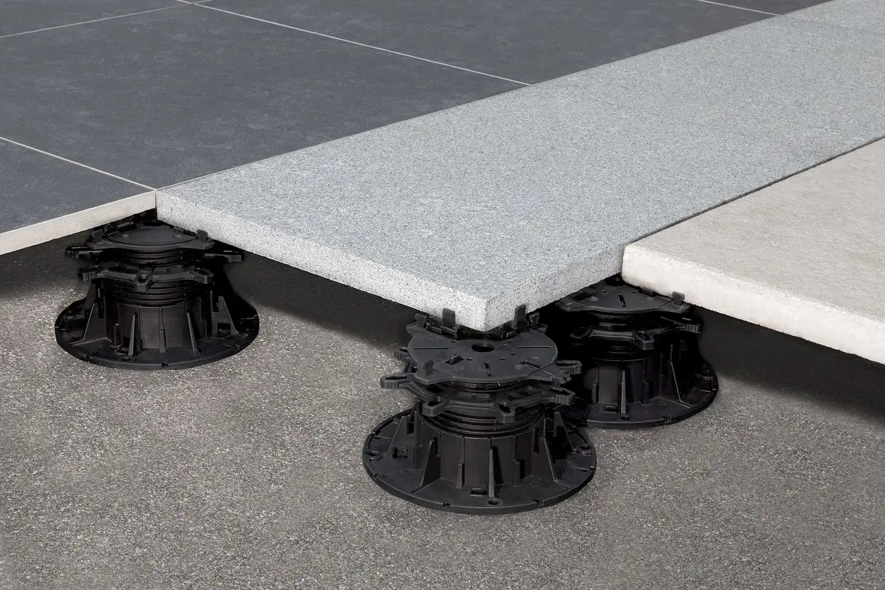Bu modelde teras plakaları uzun ömürlü bir özel plastikten, yüksekliği ayarlanabilir ayakların üzerine oturur.